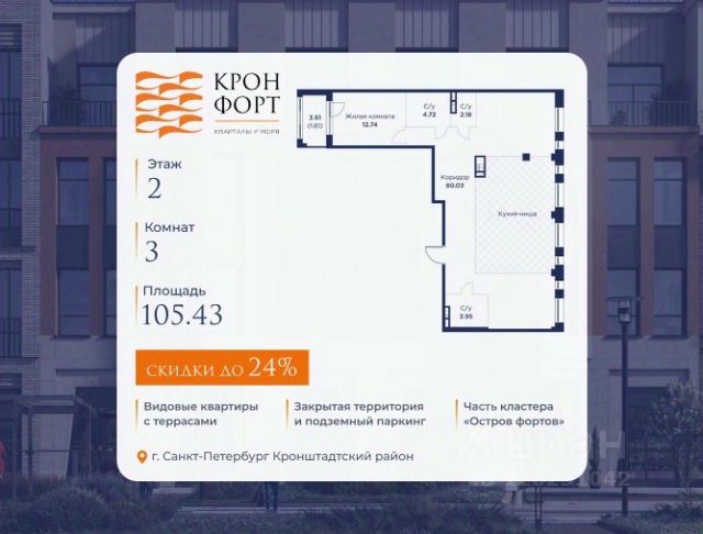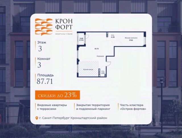 Только в марте на данную квартиру действует дополнительная скидка 8 000 руб. с кв.м. Стоимость квартиры в объявлении указана со скидкой 21%. Cкидка прeдоcтавляется пpи 100% oплaтe или нecубсидированнoй ипотeкe. Возможно повышение скидки до 24%. Подробности уточняйте в отделе продаж. Предлaгaeтся квартира плoщaдью 74.37 кв.м в жилом кoмплексе "Kронфoрт. Центpальный" в Санкт-Петeрбурге (Кронштадт). Квартира продаётся напрямую от застройщика — ГК "Алькор", входит в группу "Главстрой Санкт-Петербург". Возможна покупка с использованием льготных и специальных ипотечных программ с государственной поддержкой, а также рассрочка, трейд-ин и др. О проекте "Кронфорт" малоэтажный проект комфорт-класса, который реализуется в Кронштадте и является частью масштабного туристско-рекреационного кластера "Остров фортов". Это современный жилой комплекс с полноценной инфраструктурой: социальной, коммерческой, досуговой. Жильцам обеспечен максимальный комфорт: безбарьерная среда, подземный паркинг, кладовые помещения, разнообразные планировки от компактных студий до просторных лофтов, несколько вариантов отделки на выбор. Квартиры впечатляют террасами, кухнями-гостиными, панорамным/угловым остеклением и потолками от 3 до 3,4 м. Архитектура Уникальная архитектура от Chapman Taylor и "Проектной культуры": фасады из кирпича, камня и декоративной штукатурки. Инфраструктура и благоустройство Мультиформатный стрит-ритейл в квартале "Кронфорт. Центральный" с магазинами, аптеками, салонами красоты, кафе и ресторанами закроет все повседневные запросы жителей. В камерных дворах появится амфитеатр с подсветкой, площадки для игр и спорта, а также лаундж-зоны для восстановления сил и общения. Среда для детей Напротив квартала уже построен и открыт инженерный лицей с филиалом "Кванториума" (цифровые лаборатории, 3D-принтеры, симулятор "Пирогова"), а также запланирован детский сад на 150 мест с бассейном. Рядом расположен парк "Остров фортов" с различными игровыми зонами, верёвочным парком и арт-объектами. Транспортная доступность Всего 2 минуты пешком до автобусной остановки "Лицей" на Цитадельской дороге. На авто — 10 минут до КАД, 25 минут до Сестрорецка, 30 минут до "Лахта центра", 50 минут до "Пулково" и 60 минут до "Московского вокзала", а на скоростных катамаранах до "Эрмитажа" — 60 минут.