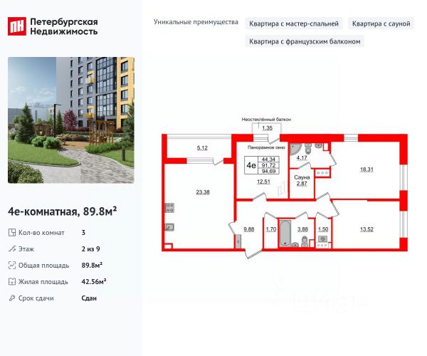 Продаётся 3-комнатная квартира в строящемся доме по адресу ул. Береговая, дом 12, ЖК "Loft у Озера". ЖК расположен в Выборгском районе Санкт-Петербурга, МО Шувалово-Озерки, в 300-х метрах от Большого Суздальского озера. До метро Проспект Просвещения и метро Озерки 8 минут на машине. ДОМ СДАН Проектное финансирование строительства осуществляет ПАО "СБЕРБАНК". Застройщик ООО "СЗ "ИНТЕСКОМ". Жилой комплекс "Loft у Озера" аккредитован в 13- банках Квартира общей площадью 93,75 м2 расположена на 2-м этаже. 4Е планировка. Отделка черновая. Высота потолков 2,85 м. Кухня-гостиная 21,50 м2. Квартира трехсторонняя. Два санузла. Два балкона-веранды с панорамным остеклением. Площадь первого балкона-веранды - 6,93 м2, ширина 1,45 м. Площадь второго - 8,95 м2, ширина 1,48 м. ЖК "Loft у Озера" это уникальный клубный проект бизнес-класса с авторской архитектурой в стиле LOFT, расположенный в самой живописной и элитной части Выборгского района Петербурга. Состоит из двух домов: Дом 8 на 16 квартир и Дом 12 на 59 квартир. 5 ПРИЧИН ВЫБРАТЬ ЖК Loft у Озера: 1. СТИЛЬНАЯ АРХИТЕКТУРА проекта в стиле Loft 2. УЕДИНЕННАЯ АТМОСФЕРА клубного дома 3. ЗЕЛЕНАЯ ЛОКАЦИЯ В МЕГАПОЛИСЕ 4. СМАРТ ПРОСТРАНСТВО внутреннего двора 5. СОВРЕМЕННЫЕ РЕШЕНИЯ ЖК бизнес-класса ОСОБЕННОСТИ ЖК "Loft у Озера": БЛАГОУСТРОЙСТВО: закрытая охраняемая территория двора с ландшафтным дизайном, открытыми парковками. Спортивная площадка с теннисным столом, чилл зона с шезлонгами, территория для отдыха взрослых, место для работы и общения, детская площадка, велопарковки. ПОДЗЕМНЫЙ ПАРКИНГ на 31 машиноместо располагается в доме 12. Машиноместа продаются как отдельные объекты недвижимости. Вход в паркинг отдельный. Лифт в подземный паркинг не предусмотрен. КЛАДОВЫЕ ПОМЕЩЕНИЯ площадью от 2,4 до 10,2 м2 расположены в доме 12. ПАТИО. Все квартиры на 1-х этажах имеют выход на площадку для отдыха возле дома, огороженную живой изгородью. БАЛКОНЫ - ВЕРАНДЫ во всех квартирах. Площадь от 7,5 до 9,5 м2. Глубина от 1.4 до 2 м. ПАНОРАМНОЕ ОСЕКЛЕНИЕ балконов. Увеличенные окна. Классические и ЕВРО ПЛАНИРОВКИ. Кухни от 11 до 23 м2. 46 см толщина наружных стен. УСИЛЕННАЯ ЗВУКОИЗОЛЯЦИЯ в межэтажных перекрытиях. БЕЗБАРЬЕРНАЯ СРЕДА: Все лифты грузовые. Входы в подъезды и входы в лифты располагаются на уровне земли. Не нужно подниматься по ступеням, чтобы попасть в дом или в лифт. ТЕХНОЛОГИЧНЫЕ РЕШЕНИЯ: зарядное устройство для электронных приборов во дворе, зарядная станция для электромобилей, Wi-Fi покрытие дворовой территории, оптоволокно до дверей каждой квартиры, умный доступ во двор и в дом.