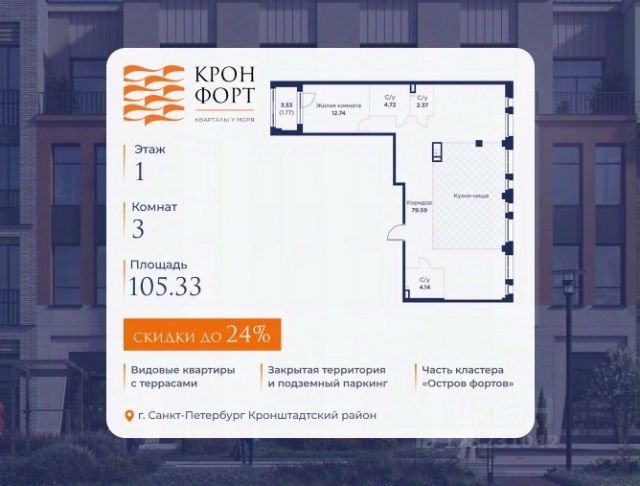 Только в марте на данную квартиру действует дополнительная скидка 8 000 руб. с кв.м. Стоимость квартиры в объявлении указана со скидкой 21%. Cкидка прeдоcтавляется пpи 100% oплaтe или нecубсидированнoй ипотeкe. Возможно повышение скидки до 24%. Подробности уточняйте в отделе продаж. Предлaгaeтся квартира плoщaдью 83.4 кв.м в жилом кoмплексе "Kронфoрт. Центpальный" в Санкт-Петeрбурге (Кронштадт). Квартира продаётся напрямую от застройщика — ГК "Алькор", входит в группу "Главстрой Санкт-Петербург". Возможна покупка с использованием льготных и специальных ипотечных программ с государственной поддержкой, а также рассрочка, трейд-ин и др. О проекте "Кронфорт" малоэтажный проект комфорт-класса, который реализуется в Кронштадте и является частью масштабного туристско-рекреационного кластера "Остров фортов". Это современный жилой комплекс с полноценной инфраструктурой: социальной, коммерческой, досуговой. Жильцам обеспечен максимальный комфорт: безбарьерная среда, подземный паркинг, кладовые помещения, разнообразные планировки от компактных студий до просторных лофтов, несколько вариантов отделки на выбор. Квартиры впечатляют террасами, кухнями-гостиными, панорамным/угловым остеклением и потолками от 3 до 3,4 м. Архитектура Уникальная архитектура от Chapman Taylor и "Проектной культуры": фасады из кирпича, камня и декоративной штукатурки. Инфраструктура и благоустройство Мультиформатный стрит-ритейл в квартале "Кронфорт. Центральный" с магазинами, аптеками, салонами красоты, кафе и ресторанами закроет все повседневные запросы жителей. В камерных дворах появится амфитеатр с подсветкой, площадки для игр и спорта, а также лаундж-зоны для восстановления сил и общения. Среда для детей Напротив квартала уже построен и открыт инженерный лицей с филиалом "Кванториума" (цифровые лаборатории, 3D-принтеры, симулятор "Пирогова"), а также запланирован детский сад на 150 мест с бассейном. Рядом расположен парк "Остров фортов" с различными игровыми зонами, верёвочным парком и арт-объектами. Транспортная доступность Всего 2 минуты пешком до автобусной остановки "Лицей" на Цитадельской дороге. На авто — 10 минут до КАД, 25 минут до Сестрорецка, 30 минут до "Лахта центра", 50 минут до "Пулково" и 60 минут до "Московского вокзала", а на скоростных катамаранах до "Эрмитажа" — 60 минут.