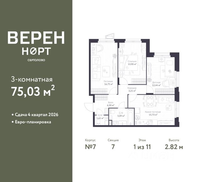Продаётся 3-комнатная квартира в строящемся доме (Корпус 8.2), срок сдачи: II-кв. 2026, общей площадью 75.07 кв.м., на 1 этаже. ЖК расположен в Сертолово, мкр.Черная речка. 25 минут на машине до метро Парнас, либо 30 минут до метро Пр.Просвещения. 1 ноября 2022 г. объявлен старт продаж, а значит именно сейчас самые привлекательные цены. Проектное финансирование строительства осуществляет ПАО "Сбербанк". Объект аккредитован по ипотеке в ведущих банках, есть выгодные варианты рассрочки от застройщика, принимается мат.капитал. ЖК "Новая история" это новый малоэтажный жилой комплекс, имеющий свой неповторимый стиль. КОНКУРЕНТНЫЕ ПРЕИМУЩЕСТВА ЖК "НОВАЯ ИСТОРИЯ" 1. Технология строительства кирпично-монолитные дома. 2. Привлекательные современные фасадные решения. 3. Просторные остекленные балконы/лоджии почти в каждой квартире. 4. Закрытые дворы. Посадка жилых домов сформирована таким образом, что каждые 2 дома объединяются общим дворовым пространством, которое огораживается забором. 5. Видеонаблюдение в каждом доме и каждом дворе. Система видеонаблюдения, которой каждый покупатель может пользоваться в своем мобильном телефоне через специальное приложение. 6. Грузопассажирские двухсторонние лифты в каждом подъезде. Т.е. лифт поднимает с уровня земли на каждый этаж. Таким образом, решается вопрос с обеспечением доступа маломобильных групп населения, а также удобен для всех остальных жильцов. Нет необходимости в различных пандусах, чтобы попасть в дом или на первый этаж. 7. Колясочные в каждом подъезде. 8. Комфортная высота потолков от 2,75 до 3 м. 9. Горизонтальная система теплоснабжения (трубы отопления в квартире проходят в стяжке пола и подводятся к радиаторам), а также "безстояковая" система водоснабжения в квартирах (водорозетки устанавливаются на стене, граничащей с общим коридором, под потолком) 10. Многообразие и продуманность планировочных решений. 11. Бесплатные wi-fi зоны во дворах. 12. Велопарковки. 13. Бачки для раздельного сбора мусора. 14. Спам-контейнеры в подъездах. 15. Интернет заведен в каждую квартиру. 16. Розетки на парковках для зарядки электромобилей. 17. В каждой квартире установлен видеофон. 18. Прогулочные зоны. 19. Индивидуальная система естественной вентиляции немецкого бренда Schiedel (для каждой квартиры свой вент.канал, не соприкасающийся с другими, т.е. запахи не будут попадать из квартиры в квартиру). 20. Система "умная инженерия" в каждой квартире: -Счетчики потребления тепловой энергии для каждой квартиры с дистанционным снятием показаний (жильцы платят только за реальных расход тепла, которое они потребили) - термоголовка на каждом радиаторе (регулирует тепло в квартире, позволяет существенно экономить на теплоснабжении); - электронные датчики протечки воды и электронный механизм для запирания (отправляет сигнал о протечке в мобильное приложение, а также сразу в управляющую компанию, перекрывает воду в месте установки крана); - счетчики на воду с дистанционным снятием показаний, передающие показания автоматически