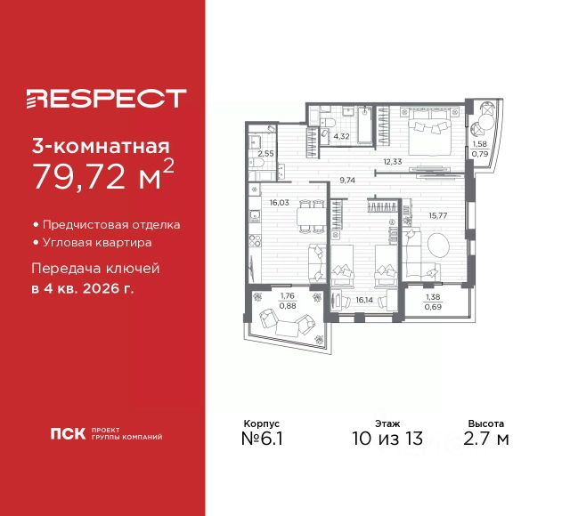 жилая 50,1 м², 3 комнаты (17,3+17,2+15,6 м²)