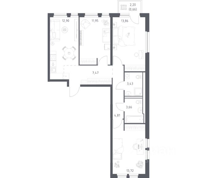 В продаже 3-комнатная квартира в корпусе 96 ЖК 'Живи! В Рыбацком'. Квартира располагается на 10 этаже, общая площадь 77.12 м2.