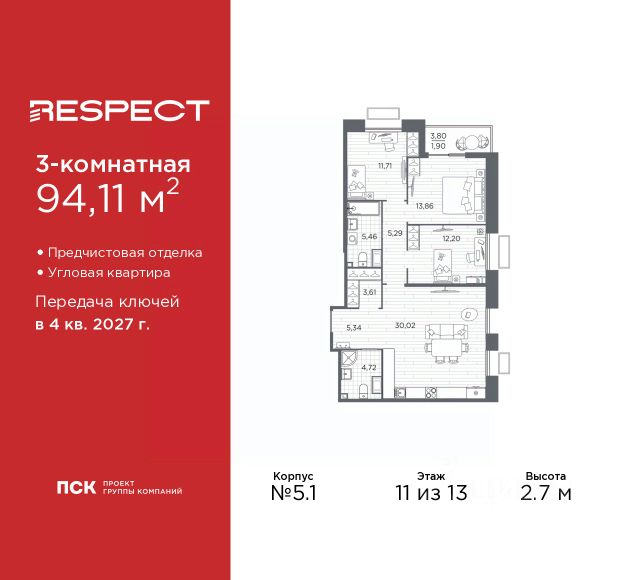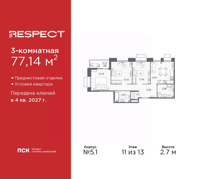 3-комн. квартира от застройщика с предчистовой отделкой в ЖК "RESPECT" на 11 этаже. Общая площадь: 77.14 кв.м., жилая: 37.67 кв.м., площадь просторной кухни-столовой: 13.97 кв.м. Квартира угловая, идеально подойдет любителям тишины и панорамных видов. В квартире одна лоджия, два совмещенных санузла. Высота потолков 2.7 м. Квартира будет сдана с отделкой WHITE BOX, в которую включены следующие виды работ: - заливка стяжки; - установлена система отопления квартиры; - подготовлены потолки; - все стены выровнены, загрунтованы и отштукатурены; - электрическая проводка разведена по комнатам. Квартира будет готова к чистовой отделке. Квартира находится в корпусе 5.1. Дом монолитный, одноподъездный, высотой 13 этажей. На этаже 7 квартир. В подъезде 1 пассажирский и 1 грузовой лифт. Начало строительства - 1 квартал 2026 года. Окончание строительства - 4 квартал 2027 года. Оформление сделки по договору долевого участия. В шаговой доступности от жилого комплекса расположены станции метро (расстояние по прямой): "Лесная" (800 м), "Площадь Мужества" (1.4 км), "Выборгская" (1.9 км), также недалеко от этого корпуса находятся станции метро: "Академическая", "Политехническая". Жилой квартал "RESPECT" строится на Полюстровском пр, 87, в одной из самых востребованных локаций Петербурга. В 10 минутах пешком - метро "Лесная" и в 10 минутах на транспорте - Петроградская сторона. Высота домов от 7 до 13 этажей. Квартиры сдаются с отделкой white box и с чистовой отделкой. На территории Respect строится школа на 1125 учащихся и детский сад на 240 мест. Запроектированы собственная газовая котельная, закрытая территория, дворы без машин и подземные паркинги с лифтами. В проекте предусмотрены трапециевидные балконы или остекленные лоджии, которые, с одной стороны, исключают монотонность фасада, являясь декоративными элементами, с другой дополнительным функциональным пространством в квартирах. Цветовая гармония фасадов каждого дома раскрывает характер квартала. Коричневый цвет клинкерного кирпича со структурой водяных штрихов — цвет уюта и безопасности, сдержанности и надёжности. Вентилируемые фасады облицованы клинкерным кирпичом. Его высокая прочность позволяет давать 100 лет гарантии на этот материал. Водопоглощение клинкерного кирпича составляет менее 5%, за счет чего у него высокая теплопроводность и прочность. В квартале запроектированы внутренние закрытые территории дворов домов без доступа автомобилей и безбарьерная среда для велосипедистов и колясок. Предусмотрены IP-домофония с функцией дистанционного открывания калиток и парадных, а также дистанционный сбор показаний счетчиков и мобильное приложение для жителей. Для безопасности жителей квартала - круглосуточное видеонаблюдение и служба охраны. В каждой квартире предусмотрены внешние корзины для кондиционеров. Вся территория квартала будет связана единой концепцией благоустройства, разработанной ландшафтным бюро L.BURO. На эксплуатируемой кровле на уровне первого этажа в домах 1 и 4 будут об