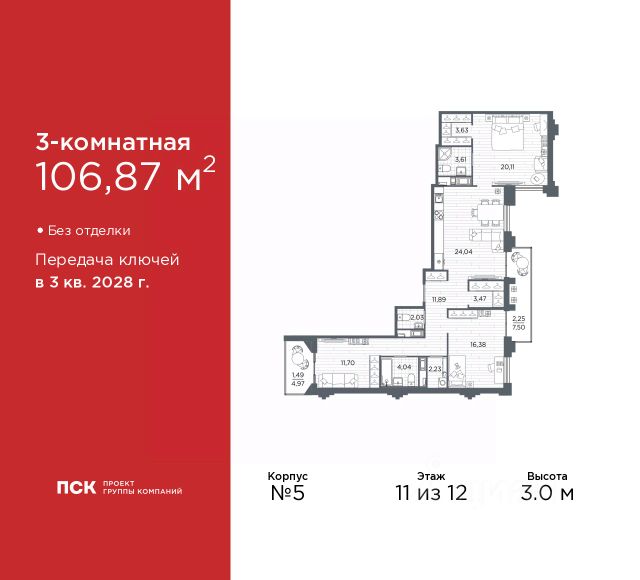 Продается трехкомнатная квартира в Клубный квартал "Ассамблея" на 11 этаже. Квартира без отделки, новый собственник может сделать ремонт по своему дизайн-проекту. Общая площадь: 106.87 кв.м., жилая: 48.23 кв.м., площадь просторной кухни-столовой: 24.04 кв.м. Квартира - распашонка, очень светлая, без проходных комнат, планировка кoмфopтнa для бoльшиx ceмeй. В квартире два балкона, два совмещенных и один раздельный санузел. Высота потолков 3.0 м. Дом монолитный, черырехподъездный, высотой 12 этажей. Квартира находится в 1-й секции в корпусе 5. На этаже 6 квартир. В подъезде 1 пассажирский и 1 грузовой лифт. Окончание строительства - 3 квартал 2028 года. Оформление сделки по договору долевого участия. В шаговой доступности от жилого комплекса расположены станции метро (расстояние по прямой): "Горный институт" (1.0 км), "Василеостровская" (1.4 км), "Приморская" (1.5 км), также недалеко от этого корпуса расположены станции метро: "Спортивная", "Чкаловская". "Клубный квартал Ассамблея" — проект бизнес-класса на Васильевском острове, в самом сердце исторического Петербурга. Комплекс состоит из пяти корпусов переменной этажности — от 7 до 12 этажей — с выразительной архитектурой в стиле неомодернизма: светлый клинкер, панорамное остекление, просторное лобби с потолками высотой почти 8 метров. Потолки — до 3,2 метров. Подземный паркинг на 667 машиномест. Комфорт и инфраструктура Проект ориентирован на комфортную городскую жизнь. В закрытом дворе — ландшафтное озеленение, современные детские и спортивные площадки. Внутренний клуб для резидентов включает коворкинг, переговорные, кинозал, фитнес и бьюти-зону. IP-домофония с просмотром камер видеонаблюдения, дистанционное открывание дверей и доступа на территорию и в парадную со смартфона и планшета, просмотр показаний счетчиков, приложение для жителей PSK Home. Локация Расположение на Васильевском острове — сильная сторона проекта. До четырех станций метро ("Горный институт", "Василеостровская", "Спортивная", "Приморская") — 515 минут пешком. В шаговой доступности — зелёные зоны, культурные учреждения, в том числе сад "Василеостровец" и ДК имени Кирова. Основные магистрали Большой, Средний и Малый проспекты, Наличная и Уральская улицы. Съезд на ЗСД расположен недалеко от станции метро "Приморская", близ береговой линии. Благовещенский и Дворцовый мосты соединяют остров с центром города, а мосты Тучков, Биржевой и Бетанкура — с Петроградской стороной. Застройщик Группа компаний ПСК является одной из ведущих девелоперских компаний Санкт Петербурга. На протяжении 18 лет она возводит в Северной столице качественное жилье премиум, бизнес и комфорт-класса, социальные объекты школы и детские сады, апарт-отели и торговые центры. Является шестикратным обладателем золотого знака "Надежный застройщик России". #zMz9gT