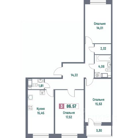 Продаётся e4 комнатная квартира (евро) в жилищном комплексе "Энфилд" (корпус Дом 18 секция 6). Общая площадь 82,09 кв. м, площадь комнат 14,95 кв.м, 13,87 кв.м, 11,91 кв.м. 2 санузла. Квартира расположена на 12 этаже 12 этажного дома. Срок сдачи корпуса IV квартал 2027 года. Современный жилой квартал "Энфилд" от компании Arsenal объединяет в себе преимущества хорошей экологии и удобного расположения рядом с городом. Квартал расположен на территории Мурино-Бугры, в 10 минутах от метро Девяткино. В состав ЖК "Энфилд" войдет 17 домов высотой до 12 этажей, 14 из них уже построено и сдано. На территории работает два детских сада и школа с углубленным изучением иностранных языков. Квартал славится красивой территорией, пешеходным бульваром с фонтанами, детскими и спортивными площадками, инфраструктурой для отдыха. В 5 минутах ходьбы расположен гипермаркет "Лента", из квартала предусмотрен удобный выезд на КАД.