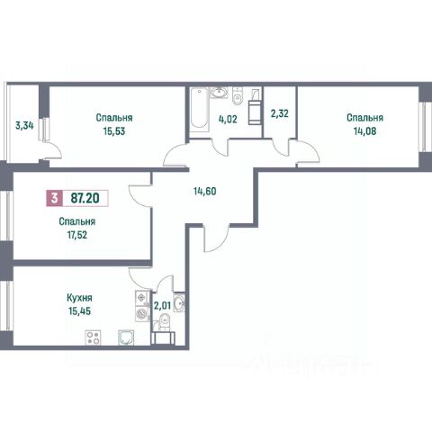 Три изолированные комнаты 18,4/17,7/14,3 м². Две детские или детская+кабинет; родители спят отдельно — никто никому не мешает.