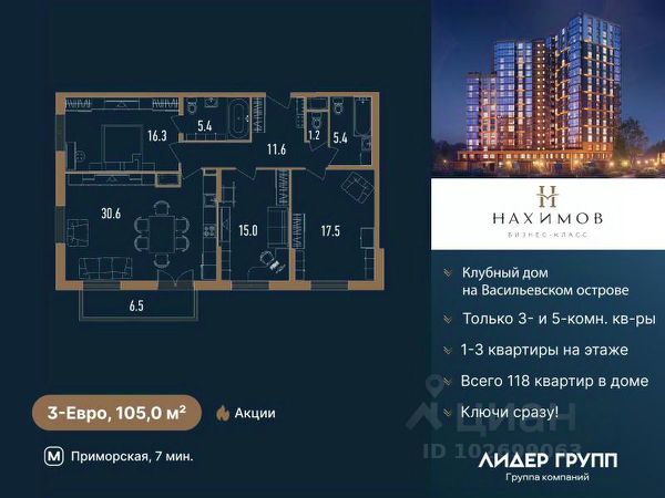 Квартира номер - 112/32. Ваша квартира — это идеально продуманное пространство: - КВАРТИРА НА ДВЕ СТОРОНЫ — открывается вид на благоустроенный двор и город. - БАЛКОН ИЗ КУХНИ — удобно выходить с утренним кофе на свежий воздух. - НИША ПОД ШКАФ ПРИ ВХОДЕ — возможность организовать удобный гардероб. - ПАНОРАМНЫЕ ОКНА В ПОЛ— максимальное количество света и красивые виды. - ТРИ САНУЗЛА — один из которых можно оборудовать под прачечную. - ДВА ОКНА В КУХНЕ-ГОСТИНОЙ — многократно усиливают ощущение простора. - УДОБНАЯ КУХНЯ-ГОСТИНАЯ — идеальное место для семейных обедов, приемов гостей и создания уютной атмосферы. - РАСПАШНЫЕ ДВЕРИ В ПОЛ НА ЛОДЖИЮ — стирают границы между интерьером и улицей, создавая эффект просторной террасы. - НИША ПОД КОНДИЦИОНЕР — готовое технологическое решение для комфортного микроклимата без ущерба для ремонта. ЖК "Нахимов" — готовый клубный дом бизнес-класса ВСЕГО на 118 квартир. Эталон безупречного стиля и приватной жизни всего в 600 метрах от набережной Финского залива, что гарантирует близость к центру города и удобный выезд на ЗСД. В ЖК "Нахимов" ТОЛЬКО трёх- и пятикомнатные квартиры! Эксклюзивные планировки площадью от 100 до 215 м². 18-этажная элегантная высотка с фасадами в насыщенных шоколадных тонах и золотыми акцентами стала новой архитектурной жемчужиной Васильевского острова. Вас встречают дизайнерская отделка холлов и клубная атмосфера, подчеркивающие статус вашего выбора. Панорамные французские окна с живописными видами на город и двор создают особую атмосферу. А благоприятная экология и развитая инфраструктура района делают жизнь здесь по-настоящему комфортной. Для настоящих ценителей недвижимости предлагаются уникальные квартиры с террасами на 14 этаже — ваша квартира будет единственной в секции, что подчеркивает эксклюзивность и принцип "мало квартир на этаже". Собственный детский сад на первом этаже, школа во дворе, подземный паркинг, современные инженерные системы и безупречный сервис. Ваш шанс поселиться у воды — последние квартиры в продаже! Дом сдан. Успейте купить по выгодной цене!