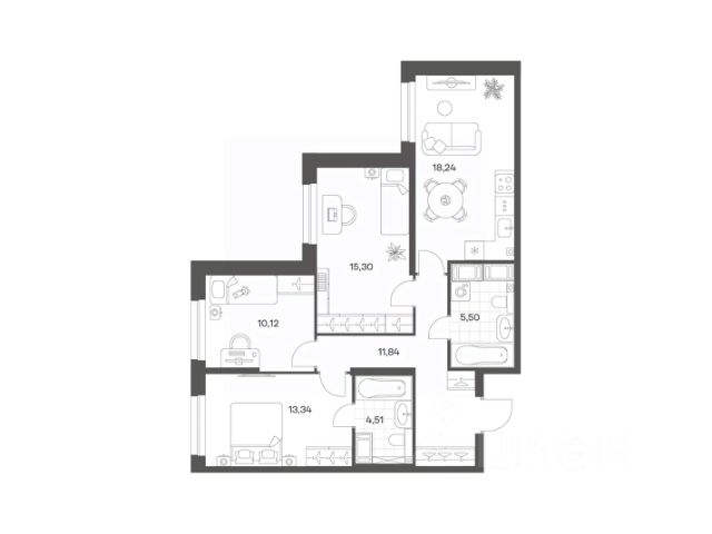 Отличная планировка квартиры, изолированные комнаты: 13.6кв.м, 15.0кв.м, и 17.9кв.м с красивым видом из окон; кухня 16.7 кв.м с выходом на застекленную лоджию 3.6 кв., раздельный сан.узел и гардеробная.