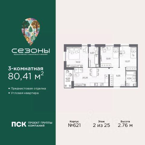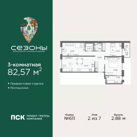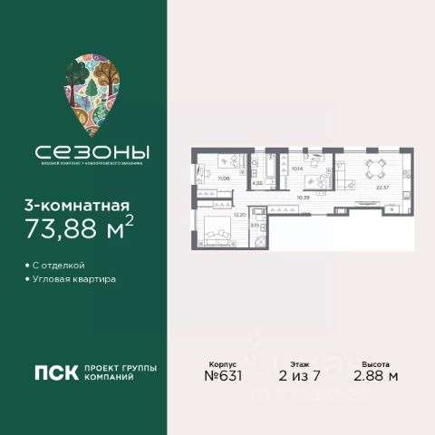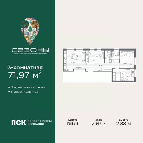 Продается 3-комн. квартира с предчистовой отделкой в ЖК "Сезоны" на 2 этаже. Общая площадь: 71.97 кв.м., жилая: 34.48 кв.м., площадь просторной кухни-столовой: 18.88 кв.м. Квартира угловая, очень светлая, естественная вентиляция при открытии окон. В квартире два совмещенных санузла. Высота потолков 2.88 м. Дом монолитный, многоподъездный, высотой 7 этажей. Квартира находится в 1-й секции в корпусе 611. На этаже 4 квартиры. В подъезде 1 грузовой лифт. Начало строительства - 4 квартал 2025 года. Окончание строительства - 2 квартал 2028 года. Оформление сделки по договору долевого участия. Видовой жилой комплекс "Сезоны" от ГК ПСК возводится в одном из самых востребованных и престижных районов Санкт-Петербурга - Приморском, рядом с Суздальским и Выборгским шоссе. Такое расположение обеспечивает удобный выезд в разные части города, сочетая городской комфорт с близостью к природе. Всего в 50 метрах находится природный заказник "Новоорловский" и речка Каменка, а в пешей доступности - Суздальские озёра. Приморский район отличается развитой социальной и транспортной инфраструктурой. Здесь расположены крупные торговые и деловые центры, современные спортивные объекты, медицинские учреждения, магазины, кафе и рестораны. Комплекс включает четыре корпуса, ввод которых в эксплуатацию запланирован на 2028 год. Проект и прилегающий микрорайон разработаны в соответствии с концепцией "15-минутного города", при которой вся необходимая инфраструктура находится в шаговой доступности. В ближайшем окружении - две школы, пять детских садов, магазины, кафе, салоны красоты, банковские отделения и пункты выдачи заказов. Также предусмотрены два четырёхъярусных паркинга с лифтами на 288 машиномест. О застройщике ГК ПСК - один из крупнейших девелоперов Санкт-Петербурга с более чем 18-летней историей. Компания реализует проекты во всех сегментах недвижимости - от премиальных жилых комплексов до масштабных кварталов комфорт-класса и апарт-отелей. По данным портала ЕРЗ.РФ, ПСК входит в ТОП-3 крупнейших застройщиков Санкт-Петербурга по объёму текущего строительства. Портфель компании превышает 3 млн кв. м жилой и коммерческой недвижимости. Все объекты сдаются строго в срок и отличаются высоким уровнем архитектурных и инженерных решений. #2TOo7f