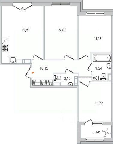 Три отдельные изолированные комнаты - 13.5 кв.м., 14 кв.м., 19.2 в.м. расположены в приватной части квартиры.