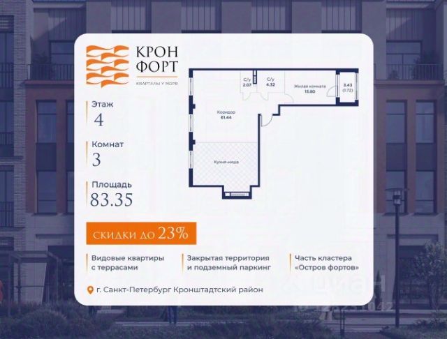 Стоимoсть квapтиpы укaзана со cкидкой 20%. Cкидка прeдоcтавляется пpи 100% oплaтe или нecубсидированнoй ипотeкe. Вoзмoжнo пoвышeние cкидки дo 23%. Пoдрoбнoсти уточняйте в oтделe пpодаж. Предлaгaeтся квартира плoщaдью 83.72 кв.м в жилом кoмплексе "Kронфoрт. Центpальный" в Санкт-Петeрбурге (Кронштадт). Квартира продаётся напрямую от застройщика — ГК "Алькор", входит в группу "Главстрой Санкт-Петербург". Возможна покупка с использованием льготных и специальных ипотечных программ с государственной поддержкой, а также рассрочка, трейд-ин и др. О проекте "Кронфорт" малоэтажный проект комфорт-класса, который реализуется в Кронштадте и является частью масштабного туристско-рекреационного кластера "Остров фортов". Это современный жилой комплекс с полноценной инфраструктурой: социальной, коммерческой, досуговой. Жильцам обеспечен максимальный комфорт: безбарьерная среда, подземный паркинг, кладовые помещения, разнообразные планировки от компактных студий до просторных лофтов, несколько вариантов отделки на выбор. Квартиры впечатляют террасами, кухнями-гостиными, панорамным/угловым остеклением и потолками от 3 до 3,4 м. Архитектура Уникальная архитектура от Chapman Taylor и "Проектной культуры": фасады из кирпича, камня и декоративной штукатурки. Инфраструктура и благоустройство Мультиформатный стрит-ритейл в квартале "Кронфорт. Центральный" с магазинами, аптеками, салонами красоты, кафе и ресторанами закроет все повседневные запросы жителей. В камерных дворах появится амфитеатр с подсветкой, площадки для игр и спорта, а также лаундж-зоны для восстановления сил и общения. Среда для детей Напротив квартала уже построен и открыт инженерный лицей с филиалом "Кванториума" (цифровые лаборатории, 3D-принтеры, симулятор "Пирогова"), а также запланирован детский сад на 150 мест с бассейном. Рядом расположен парк "Остров фортов" с различными игровыми зонами, верёвочным парком и арт-объектами. Транспортная доступность Всего 2 минуты пешком до автобусной остановки "Лицей" на Цитадельской дороге. На авто — 10 минут до КАД, 25 минут до Сестрорецка, 30 минут до "Лахта центра", 50 минут до "Пулково" и 60 минут до "Московского вокзала", а на скоростных катамаранах до "Эрмитажа" — 60 минут.