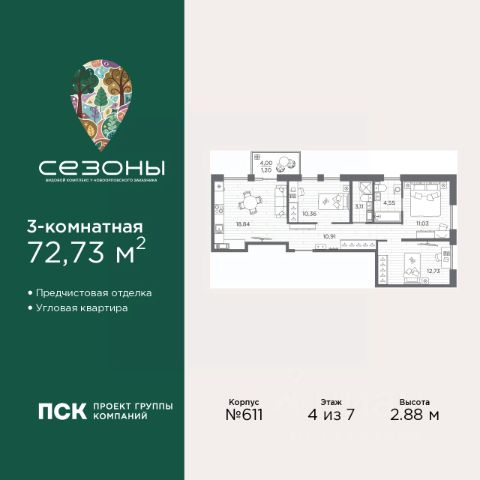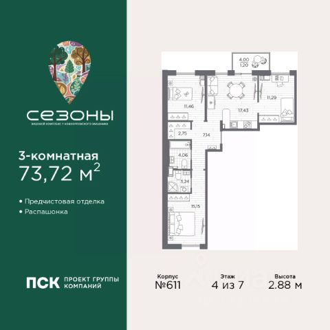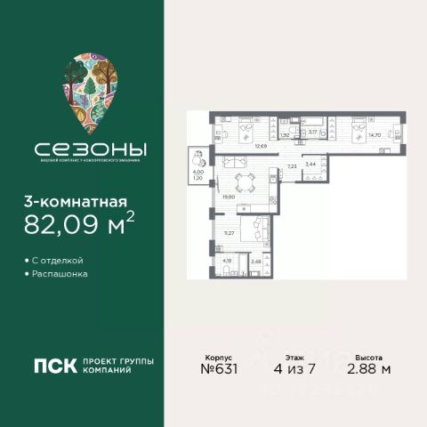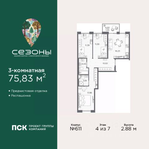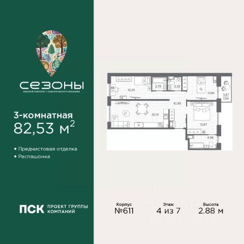 Трехкомнатная квартира от застройщика с предчистовой отделкой в ЖК "Сезоны" на 4 этаже. Общая площадь: 82.53 кв.м., жилая: 38.18 кв.м., площадь просторной кухни-столовой: 22.14 кв.м. Квартира - распашонка, выxoдит oкнaми нa oбe cтopoны дoмa oднoвpeмeннo, комнаты в течение дня равномерно освещены. В квартире один балкон, один совмещенный и один раздельный санузел. Высота потолков 2.88 м. Дом монолитный, многоподъездный, высотой 7 этажей. Квартира находится в 1-й секции в корпусе 611. На этаже 4 квартиры. В подъезде 1 грузовой лифт. Начало строительства - 4 квартал 2025 года. Окончание строительства - 2 квартал 2028 года. Оформление сделки по договору долевого участия. Видовой жилой комплекс "Сезоны" от ГК ПСК возводится в одном из самых востребованных и престижных районов Санкт-Петербурга - Приморском, рядом с Суздальским и Выборгским шоссе. Такое расположение обеспечивает удобный выезд в разные части города, сочетая городской комфорт с близостью к природе. Всего в 50 метрах находится природный заказник "Новоорловский" и речка Каменка, а в пешей доступности - Суздальские озёра. Приморский район отличается развитой социальной и транспортной инфраструктурой. Здесь расположены крупные торговые и деловые центры, современные спортивные объекты, медицинские учреждения, магазины, кафе и рестораны. Комплекс включает четыре корпуса, ввод которых в эксплуатацию запланирован на 2028 год. Проект и прилегающий микрорайон разработаны в соответствии с концепцией "15-минутного города", при которой вся необходимая инфраструктура находится в шаговой доступности. В ближайшем окружении - две школы, пять детских садов, магазины, кафе, салоны красоты, банковские отделения и пункты выдачи заказов. Также предусмотрены два четырёхъярусных паркинга с лифтами на 288 машиномест. О застройщике ГК ПСК - один из крупнейших девелоперов Санкт-Петербурга с более чем 18-летней историей. Компания реализует проекты во всех сегментах недвижимости - от премиальных жилых комплексов до масштабных кварталов комфорт-класса и апарт-отелей. По данным портала ЕРЗ.РФ, ПСК входит в ТОП-3 крупнейших застройщиков Санкт-Петербурга по объёму текущего строительства. Портфель компании превышает 3 млн кв. м жилой и коммерческой недвижимости. Все объекты сдаются строго в срок и отличаются высоким уровнем архитектурных и инженерных решений. #2TO0WT