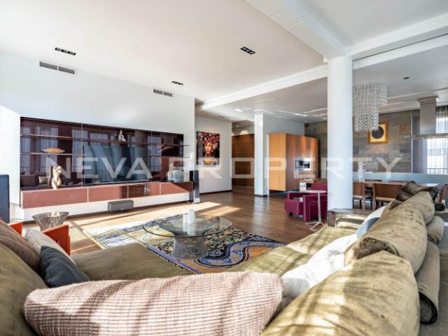 В квартире выполнен дизайнерский ремонт, вся планировка продумана до мелочей. Из квадратной форми видам необходимым для комфортного проживания оборудованием - посудомоечная машина, плита, ми. Остекление балкона выполнено по безрамной технологии Lumon. Кухня оборудована вседуховой шкаф, холодильник, вытяжка, микроволновая печь.мы просторной гостиной с тремя окнами имеется выход на кухню и спальную комнату со своей гардеробной Из гостиной есть также выход на застекленный балкон с потрясающи