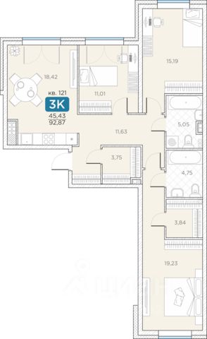 Общая площадь квартиры составляет 111,6 кв.метров, а жилая — 64,2. Просторные комнаты (21,3 + 23,1 + 19,8 кв.м) и уютная кухня (10,6 кв.м) создают идеальные условия для комфортной жизни и встреч с близкими.