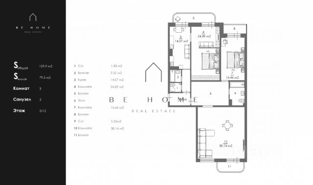 Хорошая и очень удобная планировка! Общая площадь квартиры - 76,8 кв.м. Две спальни 20,4кв.м.+ 18.4кв.м. плюс столовая-гостинная около 15 кв.м. совмещенная с кухней 9 кв.м. (при необходимости столовую-гостинную можно быстро и недорого изолировать в отдельную комнату). Спальня 20.4 кв.м. включает в себя гардеробную комнату и из этой спальни есть отдельный вход в небольшое помещение для санузла, площадью 3,5 ув.м (с окном). Высота потолков - 3.07м.