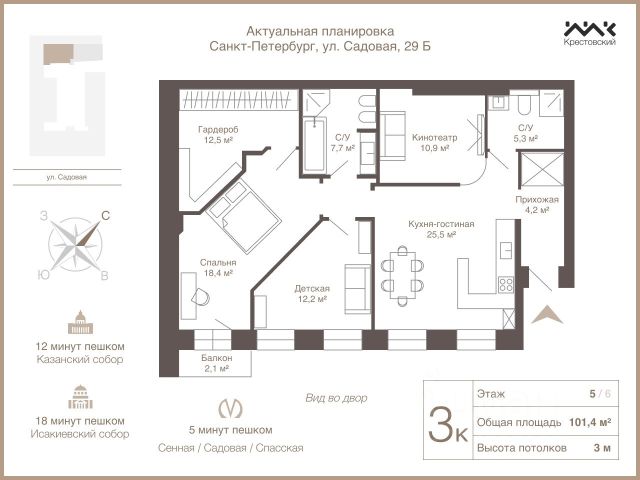 Арт. 114075222 Абсолютно готовая для жизни квартира в сердце Петербурга с качественным ремонтом и парковкой! Мечтаете о жизни в самом центре культурной столицы? Ваш шанс эта превосходная трехкомнатная квартира в историческом центре Санкт-Петербурга! • Элитная локация: Все главные достопримечательности, Невский проспект, метро "Садовая" и "Гостиный двор" в пешей доступности! Живите в центре событий. • Идеальное состояние: Квартира обрела вторую жизнь! Современный свежий ремонт выполнен с любовью для личного проживания. Переезжайте и наслаждайтесь комфортом сразу. • Полная комплектация: В стоимость входит вся необходимая мебель и бытовая техника. Никаких дополнительных трат и хлопот! Продуманная планировка включает в себя: o Светлую кухню-гостиную (25.5 м²): Сердце дома для приема гостей и семейных вечеров. o Уединенную спальню (18.4 м²) + вместительная гардеробная (12.5 м²): Ваш личный уголок спокойствия и порядка. o Отдельную комнату (10.9 м²): Готова стать уютным домашним кинотеатром, кабинетом или гостевой комнатой. o Детская/кабинет (12.2 м²): Универсальное пространство, легко адаптируемое под ваши нужды. o Два отдельных санузла: Удобство для всей семьи или гостей. o Атмосферный балкон: идеальное место для утреннего кофе • Дополнительный комфорт: Кондиционирование во всей квартире, собственный личный тамбур (используется как просторная прихожая). • Надежность и безопасность: Дом после капитального ремонта (железобетонные перекрытия), новый лифт, парадная в отличном состоянии. Закрытый охраняемый двор с парковкой редкая удача в центре! Это не просто квартира, это готовый дом для счастливой жизни в самом престижном районе Петербурга! Прямая продажа от одного собственника. Никаких обременений. Собственность более 5 лет. Не упустите уникальный шанс! Звоните, чтобы увидеть квартиру своими глазами!