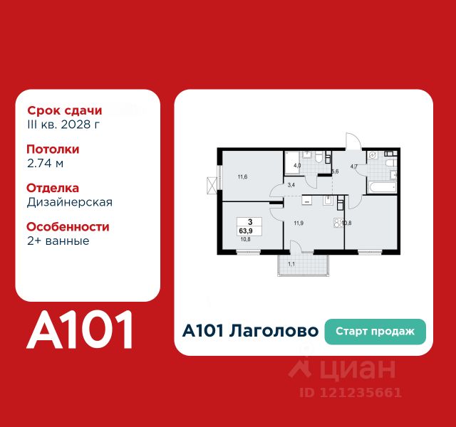 Старт продаж! 3-комнатная квартира площадью 71.07 в ЖК "А101 Лаголово" на 6 этаже. Квартира без отделки. Вид из окна на улицу. В квартире 2 санузла. Высота потолков 2.74 м. Особенность планировки - гардеробная. Предложения от застройщика на декабрь 2025: - Гибкая рассрочка 20 000 руб/мес. и первым взносом 10%. ОТДЕЛКА Квартира передается без отделки. Благодаря тому, что в данном типе отделки стены не возводятся, вы сможете создать удобную планировку и самостоятельно организовать зонирование комнат. ОСОБЕННОСТИ ПЛАНИРОВКИ Из окон квартиры открывается живописный вид на зелёный пешеходный бульвар, который строится одновременно с домами. Места для хранения находятся в прихожей и жилой зоне квартиры, дополнительно можно получить доступ к кладовым на подземном уровне (площадь - 2-8 кв. м). ПАРАДНАЯ. В каждой парадной предусмотрены места для хранения велосипедов и колясок, гостевой санузел и удобная зона ожидания для гостей. ДВОРЫ И ОКРУЖЕНИЕ. Просторные дворы безопасны для детей, так как свободны от машин, закрыты от посторонних и постоянно находятся под видеонаблюдением. Во дворах создается разнообразная среда для детей всех возрастов: детские площадки с батутами, тактильными дорожками и игровыми комплексами. Для активного отдыха - воркаут-площадки, столы для пинг-понга и газоны для занятий йогой. Во дворах есть и тихие уголки - зеленые гостиные с уличной мебелью, где можно поработать на свежем воздухе или отдохнуть в тишине. Из внутренних дворов комплекса можно выйти на пешеходный бульвар длиной около 900 метров. Здесь будет организовано полноценное общественное пространство с амфитеатром, уличным кафе, ручьем, фонтаном и множеством мест для отдыха и игр. Большую часть бульвара займут благоустроенные зеленые зоны и теневые сады из десятков видов деревьев и кустарников, многолетних цветов и трав, которые будут радовать глаз круглый год. "А101 Лаголово" - современный город у подножия знаменитых Дудерговских высот, в объятиях чистейших озер и зеленых живописных массивов, наполненный всем необходимым для счастливой жизни. ИНФРАСТРУКТУРА. Мы занимаемся комплексным освоением территории. Наш приоритет - доступность всех сервисов для счастливой жизни. 1. Лаголово-город 15-ти минутной доступности. Вся необходимая инфраструктура: магазины, салоны красоты, образовательные учреждения, медицинские центры находятся в 15-ти минутах пешей прогулки от любой точки жилого комплекса. Это позволяет не тратить время на долгие перемещения. 2. Представьте идеальный город, где ребенок может спокойно играть, а пожилой человек наслаждаться заслуженным отдыхом. Жилая среда нашего комплекса может комфортно использоваться как 8-летним ребенком, так и 80-летним пожилым человеком. Дома, улицы, общественные пространства, тротуары спроектированы с заботой о людях разных возрастов. 3. Мы активно развиваем авторскую образовательную экосистему "Лёрнити". Она включает строительство 8 современных детских садов (2000 мест) и 3 школ (2945 учащихся). Мы учим родителей гармонично