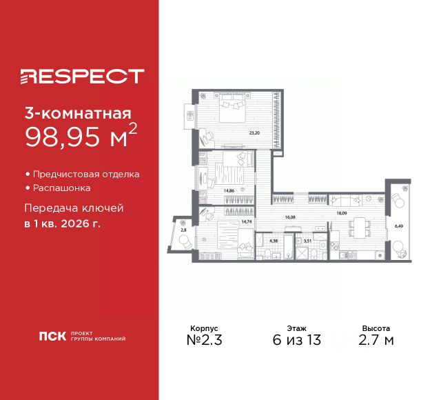 Просторная трехкомнатная квартира с предчистовой отделкой в ЖК "RESPECT" на 6 этаже. Общая площадь: 78.6 кв.м., жилая: 34.97 кв.м., площадь просторной кухни-столовой: 16.91 кв.м. Квартира угловая, окна oбecпeчивaют paвнoмepнoe ocвeщeниe в тeчeниe дня. В квартире один балкон, два совмещенных санузла. Наличие террасы в квартире открывает возможность для обустройства дополнительной площади. Высота потолков 2.7 м. Квартира находится в корпусе 1. Дом монолитный, одноподъездный, высотой 13 этажей. На этаже 6 квартир. В подъезде 1 пассажирский и 1 грузовой лифт. Окончание строительства - 1 квартал 2026 года. Оформление сделки по договору долевого участия. В шаговой доступности от дома расположены станции метро (расстояние по прямой): "Лесная" (800 м), "Площадь Мужества" (1.4 км), "Выборгская" (1.9 км), также недалеко от этого корпуса расположены станции метро: "Академическая", "Политехническая". Жилой квартал "RESPECT" строится на Полюстровском пр, 87, в одной из самых востребованных локаций Петербурга. В 10 минутах пешком - метро "Лесная" и в 10 минутах на транспорте - Петроградская сторона. Высота домов от 7 до 13 этажей. Квартиры сдаются с отделкой white box и с чистовой отделкой. На территории Respect строится школа на 1125 учащихся и детский сад на 240 мест. Запроектированы собственная газовая котельная, закрытая территория, дворы без машин и подземные паркинги с лифтами. В проекте предусмотрены трапециевидные балконы или остекленные лоджии, которые, с одной стороны, исключают монотонность фасада, являясь декоративными элементами, с другой дополнительным функциональным пространством в квартирах. Цветовая гармония фасадов каждого дома раскрывает характер квартала. Коричневый цвет клинкерного кирпича со структурой водяных штрихов — цвет уюта и безопасности, сдержанности и надёжности. Вентилируемые фасады облицованы клинкерным кирпичом. Его высокая прочность позволяет давать 100 лет гарантии на этот материал. Водопоглощение клинкерного кирпича составляет менее 5%, за счет чего у него высокая теплопроводность и прочность. В квартале запроектированы внутренние закрытые территории дворов домов без доступа автомобилей и безбарьерная среда для велосипедистов и колясок. Предусмотрены IP-домофония с функцией дистанционного открывания калиток и парадных, а также дистанционный сбор показаний счетчиков и мобильное приложение для жителей. Для безопасности жителей квартала - круглосуточное видеонаблюдение и служба охраны. В каждой квартире предусмотрены внешние корзины для кондиционеров. Вся территория квартала будет связана единой концепцией благоустройства, разработанной ландшафтным бюро L.BURO. На эксплуатируемой кровле на уровне первого этажа в домах 1 и 4 будут обустроены общественные видовые террасы. Это станет не только привлекательным местом с красивым видом, но и удобным, многофункциональным пространством. Дизайн парадных зон и входных групп - сочетание лаконичности отделки и декоративных элементов с текстурами из натурального кам