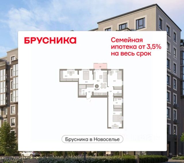 Продается 3-комн. квартира с предчистовой отделкой в ЖК "Брусника в Новоселье" на 7 этаже. Общая площадь: 91.29 кв.м., жилая: 40.6 кв.м., площадь просторной кухни-столовой: 18.3 кв.м. Квартира угловая, идеально подойдет любителям тишины и панорамных видов. В квартире один балкон, два совмещенных санузла. Высота потолков 2.7 м.