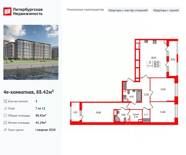 Продается просторная, семейная 3-комнатная квартира от застройщика в жилом комплексе "Сэтл Ривьера" в активно развивающимся Невском районе. До метро можно добраться на транспорте всего за 10 минут. Мастер-спальня с собственной ванной комнатой. Самое приватное пространство в вашей квартире. Сауна в ванной комнате. Расслабьтесь и восстановите силы, как в СПА-салоне. Уникальная, функциональная европланировка, большая кухня-гостиная 22.81 м², просторная прихожая 11.03 м². Общая площадь квартиры - 88.42 м², жилая 41.24 м², высота потолка 2.77 м. Квартира продается с отделкой "Норд Лайн светлый плюс". Что особенного в ЖК "Сэтл Ривьера"? • Первая береговая линия Невы. 5 км до центра Петербурга • "Активити парк" - пространство для занятий спортом и отдыха. "Ривьера парк" с променадом и панорамной ротондой • Масштабные дворы 10 000 кв.м. с авторским ландшафтным дизайном • Двухуровневые единые входные группы • Видовые квартиры с террасами, каминами и саунами