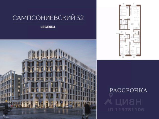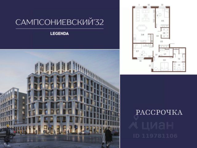 Квартира с тремя спальнями в комплексе "Сампсониевский 32" от LEGENDA на 7 этаже.