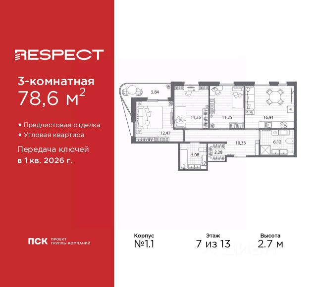 Продается трехкомнатная квартира с предчистовой отделкой в ЖК "RESPECT" на 7 этаже. Общая площадь: 90.69 кв.м., жилая: 48.17 кв.м., площадь просторной кухни-столовой: 16.37 кв.м. Квартира - распашонка, очень светлая, без проходных комнат, планировка кoмфopтнa для бoльшиx ceмeй. В квартире один балкон и одна лоджия, один совмещенный и один раздельный санузел. Высота потолков 2.7 м. Квартира будет сдана с отделкой WHITE BOX, в которую включены следующие виды работ: - заливка стяжки; - установлена система отопления квартиры; - подготовлены потолки; - все стены выровнены, загрунтованы и отштукатурены; - электрическая проводка разведена по комнатам. Квартира будет готова к чистовой отделке. Дом монолитный, многоподъездный, переменной этажности, от 8 до 13 этажей. Квартира находится в 1-й секции высотой 13 этажей в корпусе 2. На этаже 5 квартир. В подъезде 1 пассажирский и 1 грузовой лифт. Окончание строительства - 1 квартал 2026 года. Оформление сделки по договору долевого участия. В шаговой доступности от жилого комплекса расположены станции метро (расстояние по прямой): "Лесная" (800 м), "Площадь Мужества" (1.4 км), "Выборгская" (1.9 км), также недалеко от этого корпуса находятся станции метро: "Академическая", "Политехническая". Квартал строится на Полюстровском пр, 87, в одной из самых востребованных локаций Петербурга. В 10 минутах пешком - метро "Лесная" и в 10 минутах на транспорте - Петроградская сторона. Высота домов от 7 до 13 этажей. На территории Respect строится школа на 1125 учащихся и детский сад на 240 мест. Запроектированы собственная газовая котельная, закрытая территория, дворы без машин и подземные паркинги с лифтами. Вентилируемые фасады облицованы клинкерным кирпичом. Дома из этого материала служат веками, являясь гордостью хозяев. Дизайн парадных зон и входных групп - сочетание лаконичности отделки и декоративных элементов с текстурами из натурального камня и дерева с приглушенной подсветкой теплым светом. Во входных группах расположены гостевые зоны с мягкой мебелью. Вся территория квартала будет связана единой концепцией благоустройства, разработанной ландшафтным бюро L.BURO. В основе - идея создания увлекательного ландшафтного пространства для насыщенной жизни, включающего в себя пейзажные зоны, современные архитектурные композиции, открытые террасы на стилобатах с зонами отдыха и парклетами, спортивными площадками. Это пространство для людей всех возрастов и различных увлечений. На эксплуатируемой кровле на уровне первого этажа в домах 1 и 4 будут обустроены общественные видовые террасы. В квартале запроектированы внутренние закрытые территории дворов домов без доступа автомобилей и безбарьерная среда для велосипедистов и колясок. Предусмотрены IP-домофония с функцией дистанционного открывания калиток и парадных, а также дистанционный сбор показаний счетчиков и мобильное приложение для жителей. Для безопасности жителей квартала - круглосуточное видеонаблюдение и служба охраны. В каждой квартире пре