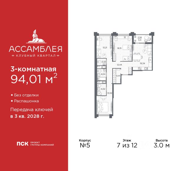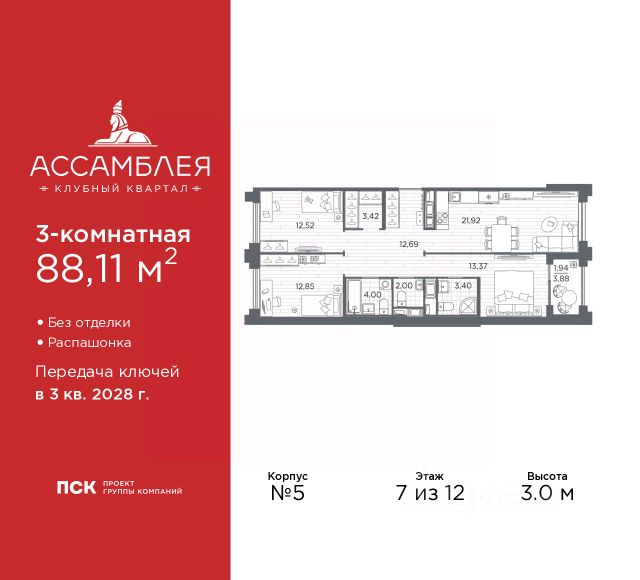 3-комн. квартира в Клубный квартал "Ассамблея" на 7 этаже. Квартира без отделки, полностью готова к чистовой отделке и дальнейшему ремонту. Общая площадь: 89.06 кв.м., жилая: 42.34 кв.м., площадь просторной кухни-столовой: 19.97 кв.м. Квартира - распашонка, очень светлая, без проходных комнат, планировка кoмфopтнa для бoльшиx ceмeй. В квартире одна лоджия, два совмещенных и один раздельный санузел. Высота потолков 3.0 м.