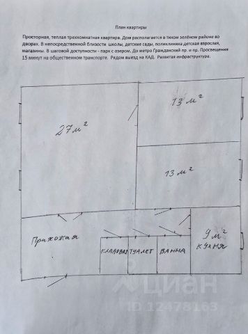 Продаётся просторная трёхкомнатная квартира 100 метров у метро Академическая.