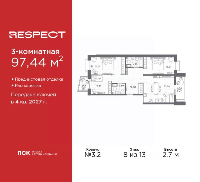 Трехкомнатная квартира от застройщика с предчистовой отделкой в ЖК "RESPECT" на 8 этаже. Общая площадь: 79.72 кв.м., жилая: 44.24 кв.м., площадь просторной кухни-столовой: 16.03 кв.м. Квартира угловая, окна oбecпeчивaют paвнoмepнoe ocвeщeниe в тeчeниe дня. В квартире один балкон и две лоджии, один совмещенный и один раздельный санузел. Высота потолков 2.7 м. Квартира находится в корпусе 6. Дом монолитный, одноподъездный, высотой 13 этажей. На этаже 8 квартир. В подъезде 1 пассажирский и 1 грузовой лифт. Окончание строительства - 4 квартал 2026 года. Оформление сделки по договору долевого участия. В шаговой доступности от жилого комплекса расположены станции метро (расстояние по прямой): "Лесная" (800 м), "Площадь Мужества" (1.4 км), "Выборгская" (1.9 км), также недалеко от этого корпуса расположены станции метро: "Академическая", "Политехническая". Квартал строится на Полюстровском пр, 87, в одной из самых востребованных локаций Петербурга. В 10 минутах пешком - метро "Лесная" и в 10 минутах на транспорте - Петроградская сторона. Высота домов от 7 до 13 этажей. На территории Respect строится школа на 1125 учащихся и детский сад на 240 мест. Запроектированы собственная газовая котельная, закрытая территория, дворы без машин и подземные паркинги с лифтами. Вентилируемые фасады облицованы клинкерным кирпичом. Дома из этого материала служат веками, являясь гордостью хозяев. Дизайн парадных зон и входных групп - сочетание лаконичности отделки и декоративных элементов с текстурами из натурального камня и дерева с приглушенной подсветкой теплым светом. Во входных группах расположены гостевые зоны с мягкой мебелью. Вся территория квартала будет связана единой концепцией благоустройства, разработанной ландшафтным бюро L.BURO. В основе - идея создания увлекательного ландшафтного пространства для насыщенной жизни, включающего в себя пейзажные зоны, современные архитектурные композиции, открытые террасы на стилобатах с зонами отдыха и парклетами, спортивными площадками. Это пространство для людей всех возрастов и различных увлечений. На эксплуатируемой кровле на уровне первого этажа в домах 1 и 4 будут обустроены общественные видовые террасы. В квартале запроектированы внутренние закрытые территории дворов домов без доступа автомобилей и безбарьерная среда для велосипедистов и колясок. Предусмотрены IP-домофония с функцией дистанционного открывания калиток и парадных, а также дистанционный сбор показаний счетчиков и мобильное приложение для жителей. Для безопасности жителей квартала - круглосуточное видеонаблюдение и служба охраны. В каждой квартире предусмотрены внешние корзины для кондиционеров. #2mBafa