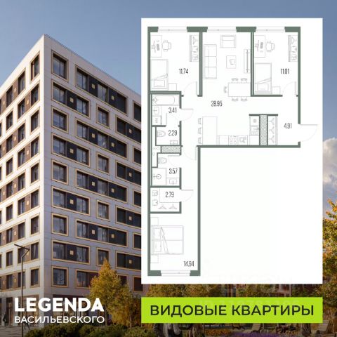 Продается 3-комн. квартира от застройщика с предчистовой отделкой в ЖК "LEGENDA Васильевского" на 8 этаже. Общая площадь: 90.97 кв.м., жилая: 36.73 кв.м., площадь просторной кухни-столовой: 25.76 кв.м. Квартира - распашонка, без проходных комнат, окна выходят на paзные стороны дома. В квартире один совмещенный и один раздельный санузел. Высота потолков 2.7 м. "LEGENDA Васильевского" жилой квартал в минутной доступности от Финского залива, главного креативного хаба Санкт-Петербурга Севкабель Порта и других точек притяжения. Современные инженерные и технические решения, повышающие качество жизни TechnoBox включают в себя: стационарный и удаленный контроль дома, систему вентиляции Air Design - здоровое дыхание без лишнего шума, мультисервисную сеть, объединяющую коммуникационные системы, удаленное управление электроприборами, контроль отопления в каждом помещении, поддерживающий оптимальный температурный баланс во время "холодного" периода", датчики протечки, датчик открытия входной двери. Мультисервисная сеть (МСС) объединяет ключевые слаботочные системы дома, задавая им единый высокий стандарт работы, обеспечивая надёжность их функционирования и управления. Квартира готова к декорированию. Застройщиком сделана шумоизоляция; стены подготовлены для отделки; проведена электрика с учетом рекомендаций по расстановке мебели и бытовой техники; выровнен пол. В каждой квартире установлена взломостойкая входная дверь, окна со специальным термоизолированным алюминиевым профилем. Двор жилого комплекса "LEGENDA Васильевского" закрыт. Проект состоит из шести разноформатных корпусов с ритмичными фасадами в духе пост-конструктивизма. Геометрия жилого комплекса состоит из четко простроенных осей, чередующих открытые пространства и объемы корпусов, каждый из которых обладает своим визуальным кодом индивидуальным рисунком фасада и цветовой палитрой. Корпуса образуют периметр с общественными пространствами: площадью с кафе, магазинами и пешеходным променадом с детскими игровыми хабами, местами для спокойного отдыха и workout-зоной. На территории комплекса предусмотрены теплый подземный паркинг и два наземных 4-х этажных паркинга.