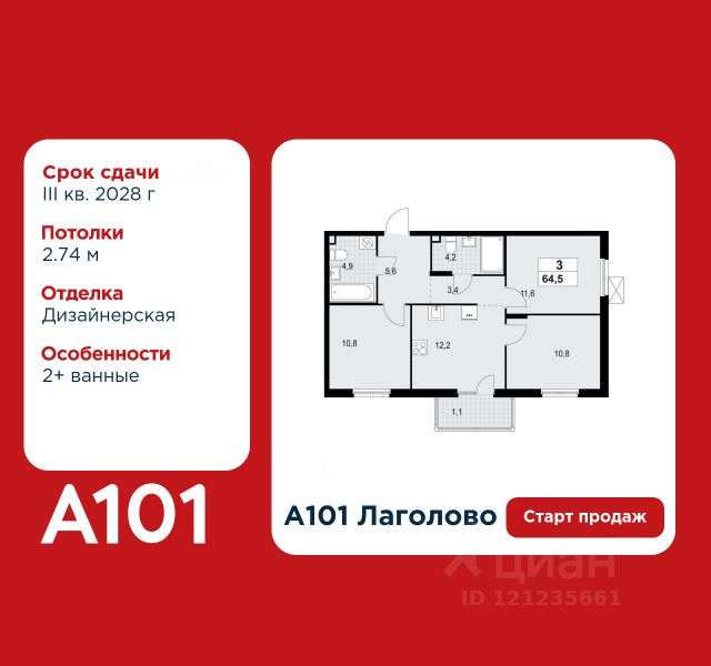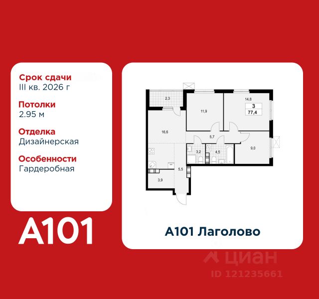 Старт продаж! 3-комнатная квартира площадью 74.06 в ЖК "А101 Лаголово" на 8 этаже. Квартира без отделки. Вид из окна на улицу. В квартире 2 санузла. Высота потолков 2.74 м. Предложения от застройщика на ноябрь 2025: - Гибкая рассрочка 20 000 руб/мес. и первым взносом 10%. ОТДЕЛКА Квартира передается без отделки. Благодаря тому, что в данном типе отделки стены не возводятся, вы сможете создать удобную планировку и самостоятельно организовать зонирование комнат. ПАРАДНАЯ. В каждой парадной предусмотрены места для хранения велосипедов и колясок, гостевой санузел и удобная зона ожидания для гостей. ДВОРЫ И ОКРУЖЕНИЕ. Просторные дворы безопасны для детей, так как свободны от машин, закрыты от посторонних и постоянно находятся под видеонаблюдением. Во дворах создается разнообразная среда для детей всех возрастов: детские площадки с батутами, тактильными дорожками и игровыми комплексами. Для активного отдыха - воркаут-площадки, столы для пинг-понга и газоны для занятий йогой. Во дворах есть и тихие уголки - зеленые гостиные с уличной мебелью, где можно поработать на свежем воздухе или отдохнуть в тишине. Из внутренних дворов комплекса можно выйти на пешеходный бульвар длиной около 900 метров. Здесь будет организовано полноценное общественное пространство с амфитеатром, уличным кафе, ручьем, фонтаном и множеством мест для отдыха и игр. Большую часть бульвара займут благоустроенные зеленые зоны и теневые сады из десятков видов деревьев и кустарников, многолетних цветов и трав, которые будут радовать глаз круглый год. "А101 Лаголово" - современный город у подножия знаменитых Дудерговских высот, в объятиях чистейших озер и зеленых живописных массивов, наполненный всем необходимым для счастливой жизни. ИНФРАСТРУКТУРА. Мы занимаемся комплексным освоением территории. Наш приоритет - доступность всех сервисов для счастливой жизни. 1. Лаголово-город 15-ти минутной доступности. Вся необходимая инфраструктура: магазины, салоны красоты, образовательные учреждения, медицинские центры находятся в 15-ти минутах пешей прогулки от любой точки жилого комплекса. Это позволяет не тратить время на долгие перемещения. 2. Представьте идеальный город, где ребенок может спокойно играть, а пожилой человек наслаждаться заслуженным отдыхом. Жилая среда нашего комплекса может комфортно использоваться как 8-летним ребенком, так и 80-летним пожилым человеком. Дома, улицы, общественные пространства, тротуары спроектированы с заботой о людях разных возрастов. 3. Мы активно развиваем авторскую образовательную экосистему "Лёрнити". Она включает строительство 8 современных детских садов (2000 мест) и 3 школ (2945 учащихся). Мы учим родителей гармонично общаться с детьми, помогаем малышам подготовиться к школе, а подросткам - выбрать будущую профессию и развить таланты. Не хватает средств на покупку кладового помещения? Оформите ипотеку на квартиру и добавьте к ней часть стоимости кладовой. ЗАСТРОЙЩИК ГК "А101" - крупный инвестиционно-строительный холдинг, занимает 6-е место Продам 3-комнатную квартиру в ипотеку в деревне Лаголово Ломоносовского района.