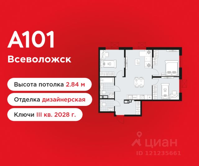 Продается квартира с 3 спальнями в жилом комплексе бизнес-класса "Взлетная 16". Общая площадь квартиры составляет 86,21 м2 из которых 23,80 м2 отведено под просторную кухню-гостиную с тремя окнами. Мастер спальня площадью 12 м2 со своим сан.узлом и гардеробной. Предусмотрена прачечная. Новый ЖК "Взлетная 16", камерный малоэтажный дом на 68 квартир. Дом состоит из трех 5-этажных секций. Комплекс является уникальным за счет небольшого количества квартир с большим выбором продуманных планировочных решений. Важной особенностью жилого комплекса является наличие подземного паркинга на 42 парковочных места + гостевая парковка, закрытый и безопасный внутренний двор, колясочные и велосипедные в парадных, 30 кладовых помещения в подземном паркинге, как дополнительное место хранения сезонных вещей. На первом этаже комплекса расположены коммерческие помещения, где разместится инфраструктура для жителей дома фитнес-студия, коворкинг, салон красоты, пекарня, магазин и пункт выдачи интернет-заказов. Также на территории комплекса расположится детское дошкольное учреждение с площадкой для игр. Вся территория комплекса, включая паркинг и прилегающие зоны, оснащена камерами видеонаблюдения. Территория двора зонирована для максимального комфорта, предусмотрены современная детская площадка, пространства для рекреации и уединения. Ландшафтный дизайн в проекте ЖК "Взлетная 16" вдохновлен стилем французского парка, растения подобраны по принципу непрерывно цветущего сада, который не требователен в уходе и адаптирован под условия северной природы. ЖК "Взлетная 16" - идеальное пространство для спокойной семейной жизни в созвучии с динамикой городского комфорта. Строгость линий, многоплановость фасадов, внимание к деталям — вот что лежит в основе подхода к архитектурным решениям, объединяющим привычную классику и актуальность. Купить 3-комнатную квартиру в ипотеку в Всеволожске.