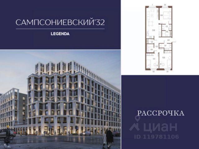 Квартира с тремя спальнями в комплексе "Сампсониевский 32" от LEGENDA на 4 этаже.