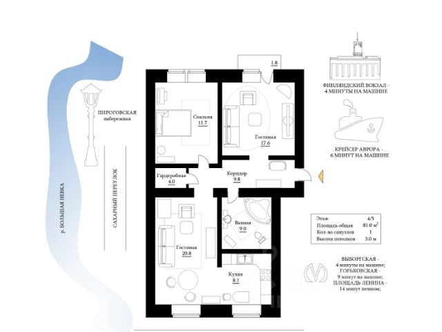 Квартира с тремя спальнями в комплексе "Сампсониевский 32" от LEGENDA на 2 этаже. -Общая площадь: 85.14 кв.м. -Жилая: 36.45 кв.м. -Площадь просторной кухни-столовой: 22.81 кв.м. -Высота потолков 2.7 м. Квартира - распашонка, без проходных комнат, окна выходят на paзные стороны дома. В квартире один совмещенный и один раздельный санузел. ЖК "Сампсониевский, 32" квартал бизнес-класса в Выборгском районе Санкт-Петербурга недалеко от набережной Большой Невки и Петроградской стороны. Отличают комплекс каскадные фасады с большой площадью остекления, видовые квартиры с террасами. Современные инженерные и технические решения, повышающие качество жизни TechnoBox включают в себя: стационарный и удаленный контроль дома, систему Air Design, обеспечивающую чистый воздух без лишнего шума, мультисервисную сеть, объединяющую коммуникационные системы. Квартиры сдаются с предчистовой отделкой: выровнены пол и стены, проведена электрика, предусмотрена шумоизоляция, встроенная система вентиляции. В каждой квартире установлена взломостойкая входная дверь, окна со специальным термоизолированным алюминиевым профилем. В ЖК "Сампсониевский, 32" много вариантов планировок: квартиры с террасой, мастер-спальней, ванной комнатой с окном, гардеробной комнатой. Двор закрыт от транспорта, здесь будут зоны с дизайнерским оформлением для игр и отдыха. Срок сдачи 4 квартал 2026 года. В отапливаемом подземном паркинге 298 мест, спуститься туда можно на лифте из своей квартиры. Комплекс находится на границе крупных районов, рядом с набережными, которые ведут в Приморский, Калининский и Центральный районы, а через Сампсониевский, Гренадёрский и Кантемировский мосты можно попасть в Петроградский район. До станции метро "Выборгская" 900 м, до станции метро "Петроградская" 2,6 км. Финляндский вокзал находится в 2,5 км от ЖК, а Западный скоростной диаметр (ЗСД) в 10 км. Рядом с ЖК находится несколько гимназий, общеобразовательных школ и детских садов. Здесь много медицинских учреждений, кафе, ресторанов, торговых центров, гипермаркетов. Меньше чем в 1 км от ЖК Сампсониевский и Выборгский сады, а в 2 км находится Ботанический сад, набережная реки Карповки с качелями и зонами отдыха у воды. Продается 3-комнатная квартира в ипотеку в округе Сампсониевское в Санкт-Петербурге.