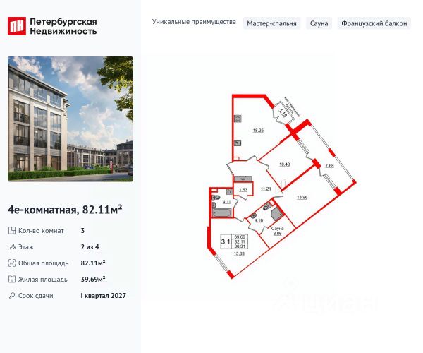Продается уютная, семейная 3-комнатная квартира от застройщика в жилом комплексе "Дворцовый фасад" в неповторимом Петродворцовом районе. До метро можно добраться на транспорте всего за 25 минут. Мастер-спальня с собственной ванной комнатой. Самое приватное пространство в вашей квартире. Сауна в ванной комнате. Расслабьтесь и восстановите силы, как в СПА-салоне. Французский балкон придает особенный европейский шик комнате. Уникальная, функциональная европланировка, большая кухня-гостиная 18.09 м², вместительная прихожая 11.21 м². Общая площадь квартиры - 81.59 м², жилая 39.69 м², высота потолка 3 м. Квартира продается с отделкой "NORD LINE WHITE". Что особенного в ЖК "Дворцовый фасад"? • В окружении дворцово-парковых ансамблей: Стрельна, Константиновский дворец, Петергоф, парк Новознаменка и Сосновая поляна, Шунгеровский лесопарк • Два собственных парка: парадный верхний для спокойного отдыха, нижний для активных занятий • Проект, соответствующий стандартам экологичного строительства, энергоэффективности, экономии и комфорта • Квартиры с саунами, возможностью установки камина и палисадниками • Малоэтажный жилой комплекс: всего 4 этажа, более половины квартир с увеличенной высотой потолка: от 3 до 5,5 м Продам 3-комнатную квартиру в ипотеку в районе Петродворцовый в Санкт-Петербурге.