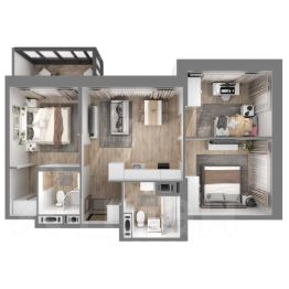 Спальня 15м2: Четырёхстворчатый распашной шкаф с ящиками и комодом. Кровать с латексно-кокосовым матрасом и прикроватными тумбами. Туалетный столик- для создания личного уголка для ухода за собой. Из спальни выход на лоджию с теплым остеклением.