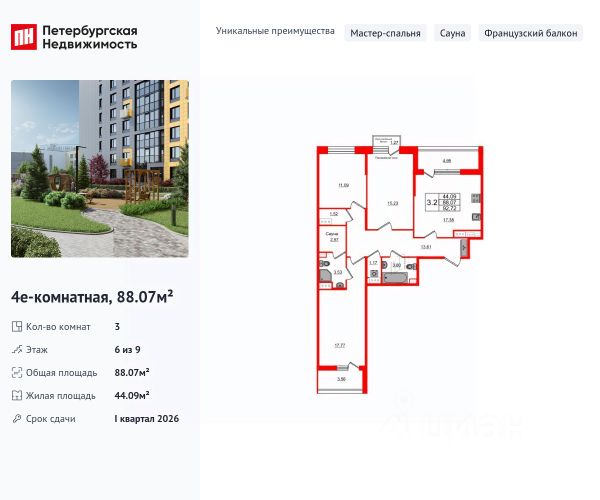 Продается уютная, семейная 3-комнатная квартира от застройщика в жилом комплексе "Прайм Приморский" в динамичном Приморском районе. До метро можно добраться на транспорте всего за 15 минут. Мастер-спальня с собственной ванной комнатой. Самое приватное пространство в вашей квартире. Сауна в ванной комнате. Расслабьтесь и восстановите силы, как в СПА-салоне. Уникальная, функциональная европланировка, большая кухня-гостиная 18.08 м², просторная прихожая 13.61 м². Общая площадь квартиры - 89.82 м², жилая 44.09 м², высота потолка 2.77 м. Квартира продается с отделкой "NORD LINE SILVER ВК". Что особенного в ЖК "Прайм Приморский"? • Живописные виды на Шуваловский карьер и лесной массив • "Парящие" французские балконы • Центральная входная группа • Креативное пространство в центре проекта, летняя терраса для отдыха • Приватные лаундж-зоны на крыше домов