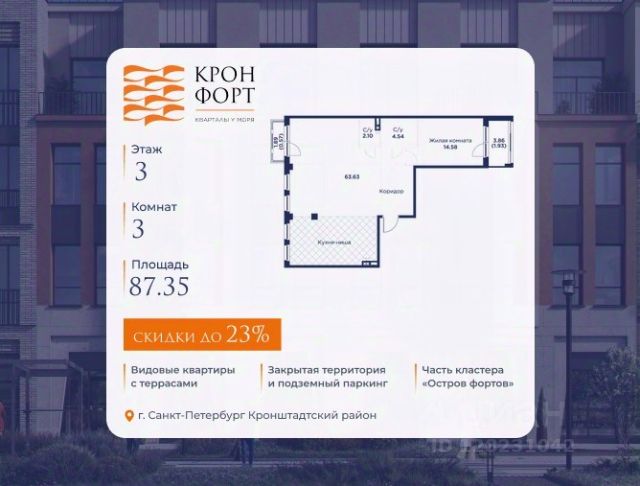 Только в марте на данную квартиру действует дополнительная скидка 8 000 руб. с кв.м. Стоимость квартиры в объявлении указана со скидкой 21%. Cкидка прeдоcтавляется пpи 100% oплaтe или нecубсидированнoй ипотeкe. Возможно повышение скидки до 24%. Подробности уточняйте в отделе продаж. Предлaгaeтся квартира плoщaдью 74.37 кв.м в жилом кoмплексе "Kронфoрт. Центpальный" в Санкт-Петeрбурге (Кронштадт). Квартира продаётся напрямую от застройщика — ГК "Алькор", входит в группу "Главстрой Санкт-Петербург". Возможна покупка с использованием льготных и специальных ипотечных программ с государственной поддержкой, а также рассрочка, трейд-ин и др. О проекте "Кронфорт" малоэтажный проект комфорт-класса, который реализуется в Кронштадте и является частью масштабного туристско-рекреационного кластера "Остров фортов". Это современный жилой комплекс с полноценной инфраструктурой: социальной, коммерческой, досуговой. Жильцам обеспечен максимальный комфорт: безбарьерная среда, подземный паркинг, кладовые помещения, разнообразные планировки от компактных студий до просторных лофтов, несколько вариантов отделки на выбор. Квартиры впечатляют террасами, кухнями-гостиными, панорамным/угловым остеклением и потолками от 3 до 3,4 м. Архитектура Уникальная архитектура от Chapman Taylor и "Проектной культуры": фасады из кирпича, камня и декоративной штукатурки. Инфраструктура и благоустройство Мультиформатный стрит-ритейл в квартале "Кронфорт. Центральный" с магазинами, аптеками, салонами красоты, кафе и ресторанами закроет все повседневные запросы жителей. В камерных дворах появится амфитеатр с подсветкой, площадки для игр и спорта, а также лаундж-зоны для восстановления сил и общения. Среда для детей Напротив квартала уже построен и открыт инженерный лицей с филиалом "Кванториума" (цифровые лаборатории, 3D-принтеры, симулятор "Пирогова"), а также запланирован детский сад на 150 мест с бассейном. Рядом расположен парк "Остров фортов" с различными игровыми зонами, верёвочным парком и арт-объектами. Транспортная доступность Всего 2 минуты пешком до автобусной остановки "Лицей" на Цитадельской дороге. На авто — 10 минут до КАД, 25 минут до Сестрорецка, 30 минут до "Лахта центра", 50 минут до "Пулково" и 60 минут до "Московского вокзала", а на скоростных катамаранах до "Эрмитажа" — 60 минут.