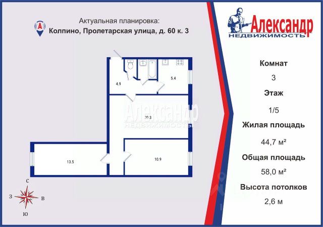 общая площадь 44,87 кв.м., жилая 27,94 кв.м. (раздельные комнаты 17,68/10,26 кв.м.), кухня 6,85 кв.м., коридор 6,62 кв.м., высота потолка 2,6 м., с/у совмещенный, в коридоре есть кладовка и антресоли.