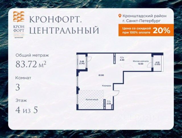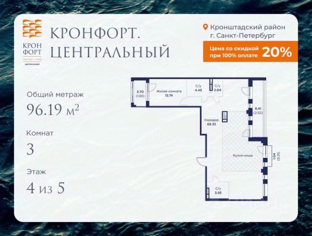 Стоимость квартиры указана со скидкой 20%. Скидка предоставляется при 100% оплате или несубсидированной ипотеке. Предлагается квартира площадью 73.67 кв.м в жилом комплексе "Кронфорт. Центральный" в Санкт-Петербурге (Кронштадт). Возможна покупка с использованием льготных и специальных ипотечных программ с государственной поддержкой. Высота потолков в квартирах — от 3 до 3,4 метров, окна увеличенного размера, есть варианты с эркерами, французскими балконами, лоджиями и террасами. Жилой квартал состоит из пяти четырехэтажных корпусов с закрытыми охраняемыми дворами, свободными от машин. Первые этажи формируют торговые променады в стиле пешеходных улиц исторической части Петербурга и Кронштадта. Внутренние пространства между корпусами — пешеходные зоны с уютными площадями. Архитектурный облик квартала разработан бюро "Проектная культура" и международной компанией Chapman Taylor. Инфраструктура комплекса включает: - Лицей с двумя бассейнами - Детский сад на 150 мест с бассейном и закрытой территорией - Веревочный парк - Игровые площадки для активного отдыха; - Кабинет врача общей практики. - Подземные паркинги с лифтами. - Мусоросборные камеры, индивидуальные кладовые. - Закрытые дворы с контролем доступа и видеонаблюдением. - Мультформатный стрит-ретейл с кафе и ресторанами. - Триатлон-центр и беговые/велодорожки. - Учебно-тренировочный комплекс для детей "Лагерь настоящих героев". Транспортная доступность обеспечивает удобный выезд на КАД (около 1-3 км), 2 минуты пешком до автобусной остановки "Лицей", 25 минут до Сестрорецка, 30 минут до "Лахта-центра", 50 минут до аэропорта "Пулково" и 60 минут до Московского вокзала. Для любителей моря доступен маршрут на "Метеоре" до центра Санкт-Петербурга. Отделка квартир предлагается как с готовой чистовой отделкой, так и со свободной планировкой без отделки для реализации индивидуальных дизайнерских решений. В третьем корпусе, продажи которого стартовали в марте 2025 года, доступны квартиры с просторными террасами, тремя балконами, кухнями-гостиными до 38 кв.м с окнами на две стороны, обеспечивающими панорамное освещение и виды. Если вам нужна помощь с оформлением ипотеки или дополнительная информация по комплексу и условиям покупки, обращайтесь в отдел продаж за консультацией.