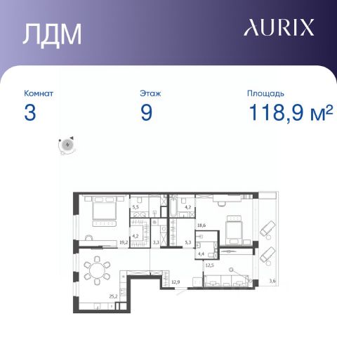 Продается 3-к квартира без отделки в ЖК "ЛДМ". Общая площадь квартиры — 118.9 кв. м, этаж 9 из 9. Тип дома — монолитный. Цена указана при 100% оплате. Описание из материнского фида