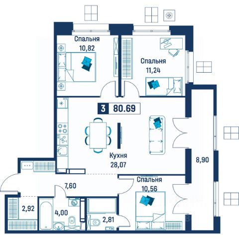 • удобная для семьи с детьми планировка в квартире три комнаты, коридор с нишей под вместительный шкаф, просторный совмещенный санузел и две застеклённые лоджии;