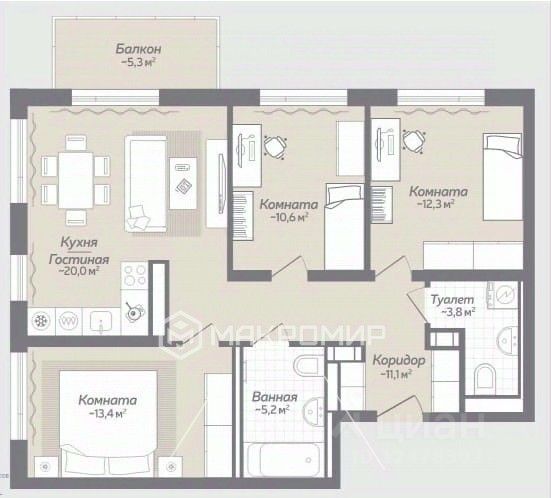 Квартира не перегружена мебелью, что позволит вам расставить все по своему усмотрению. Или при необходимости сделать ремонт.