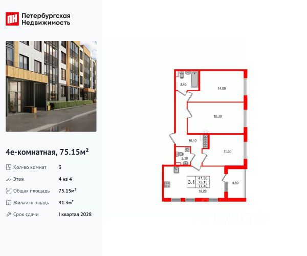 Общая площадь 66,1 кв. м Жилая 42,1 кв. м