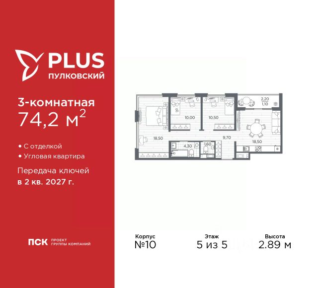 Продается 3-комн. квартира с отделкой в ЖК "PLUS Пулковский" на 5 этаже. Общая площадь: 74.55 кв.м., жилая: 38.3 кв.м., площадь просторной кухни-столовой: 18.3 кв.м. Квартира угловая, окна oбecпeчивaют paвнoмepнoe ocвeщeниe в тeчeниe дня. В квартире один балкон и одна лоджия, один совмещенный и один раздельный санузел. Высота потолков 2.89 м. Дом монолитный, трехподъездный, высотой 5 этажей. Квартира находится в 1-й секции в корпусе 13. На этаже 5 квартир. В подъезде 1 грузовой лифт. Начало строительства - 1 квартал 2026 года. Окончание строительства - 2 квартал 2027 года. Оформление сделки по договору долевого участия. Уютный пятиэтажный city квартал PLUS Пулковский расположен в престижном Московском районе на пересечении Пулковского и Волхонского шоссе в новом формирующемся микрорайоне. Рядом проходит одна из важнейших транспортных артерий города Пулковское шоссе, а в 10 минутах езды два въезда на КАД и въезд на ЗСД. Благодаря удобному и быстрому выезду на Пулковское шоссе, можно легко добраться до центра города за 35 мин. До станций метро "Московская" и "Купчино" - 15 мин. на машине, а до аэропорта Пулково - 17 мин. В составе квартала: 30 пятиэтажных домов, школа со спортивным стадионом, 2 детских сада с бассейнами, наземные и подземные паркинги, центральный зеленый бульвар с play hub и местами отдыха. Благоустройство квартала продумано до мельчайших деталей, в его основе - забота о качестве жизни каждого жителя. Дома возводятся по современной монолитной технологии строительства с вентилируемыми фасадами. Благодаря большим увеличенным окнам и отсутствию высокоэтажных домов, во всех квартирах максимальный объем естественного света. В составе квартала запланированы социально-значимые объекты: школа на 825 мест со спортивным стадионом и бассейнами, два детских сада с бассейнами на 220 мест каждый. Территория квартала зонирована таким образом, чтобы автомобильные и пешеходные потоки и не пересекались. Прогулочные и велосипедные дорожки отделены от автомобильных проездов зелеными насаждениями. Дворы закрыты для машин, что дает чувство дополнительной безопасности для жителей особенно, для самых маленьких. Вся территория квартала безбарьерная. Здесь нет пандусов, резких перепадов высот или неудобных ступеней. Вход в парадные с уровня земли. В каждом дворе есть своя оборудованная детская площадка. А в центре микрорайона расположится большая игровая площадка play hub с пространством для командных игр. PLUS Пулковский располагается в молодом микрорайоне, который сейчас находится в стадии активного развития. Он будет обладать собственной развитой инфраструктурой. В радиусе 15 минут езды на автомобиле располагаются многочисленные магазины, супермаркеты, спортивные, образовательные и медицинские учреждения, парки и достопримечательности. Для автомашин предусмотрены отдельно стоящий 5-ти этажный паркинг на 958 машино-мест, две подземные парковки на 367 машино-мест и наземные парковочные зоны по внешнему периметру микро