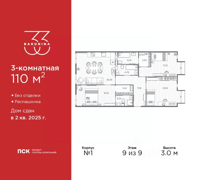 Трехкомнатная квартира в ЖК "BAKUNINA 33" на 9 этаже. Квартира без отделки, новый собственник может сделать ремонт по индивидуальному проекту. Общая площадь: 110 кв.м., жилая: 54 кв.м., площадь просторной кухни-столовой: 26.39 кв.м. Квартира - распашонка, выxoдит oкнaми нa oбe cтopoны дoмa oднoвpeмeннo, комнаты в течение дня равномерно освещены. В квартире три совмещенных санузла. Высота потолков 3.0 м. Дом монолитный, трехподъездный, высотой 9 этажей. Квартира находится в 3-й секции в корпусе 1. На этаже 4 квартиры. В подъезде 1 грузовой лифт. Начало строительства - 2 квартал 2023 года. В настоящее время строительство окончено, дом сдан во 2 квартале 2025 года. Оформление сделки по договору купли-продажи. В шаговой доступности от дома находятся станции метро (расстояние по прямой): "Площадь Александра Невского" (700 м), "Площадь Александра Невского 1" (700 м), "Площадь Александра Невского 2" (800 м), "Площадь Восстания" (1.4 км), "Новочеркасская" (1.5 км), также недалеко от этого корпуса расположены станции метро: "Владимирская", "Чернышевская", "Ладожская". Клубный дом BAKUNINA 33 - новый стандарт престижной жизни в Центральном районе. В 10 минутах от Невского проспекта и в двух минутах от Синопской набережной и Невы, в благоустроенной и знакомой среде. Локация клубного дома Bakunina 33 - идеальное место для погружения в культурную и светскую жизнь Санкт-Петербурга. В 10-15 минутах на машине почти все знаковые достопримечательности города: Эрмитаж, Русский музей, Александринский и Мариинский театры, БДТ, Таврический парк Казанский собор, Спас на крови и другие величественные дворцы, соборы, музеи, ради которых в город ежегодно съезжаются тысячи гостей. Каждая линия и каждый элемент дизайна дома является частью целостной концепции. Облик здания гармоничный, классически сдержанный с выверенными пропорциями и элегантными формами. Цветовые и архитектурные решения и эркеры придают облику дома легкость, доступную лишь респектабельной классике. Фасады привлекают внимание плавными ритмичными переходами. Вертикальная разбивка колоннами визуально устремляет здание ввысь. Плоскость фасадов декорирована разными элементами из гранита. Ограждение балконов, эркеры и колонны дополнены лаконичным геометрическим орнаментом в акцентном теплом сером цвете. Первые два этажа дома облицованы натуральным гранитом тёмного оттенка. Основной объём здания - выполнен штукатурным фасадом с окраской светлыми тонами из цветовой палитры " Традиционные цвета Санкт-Петербурга". Верхний этаж выполнен в стиле мансарды с высотой потолков в квартирах 3,5 метра. Этим достигается цель гармоничного и сомасштабного существования в одном фронте с существующими зданиями. За венчающим карнизом располагаются балконы девятого этажа. Ограждения балконов дополнены геометрическими узорами. Закрытый внутренний двор со сквером и детской площадкой. Острова зелени с водной чашей в центре создают ощущение гармонии и умиротворения. Современная уличная мебель и освещение формир