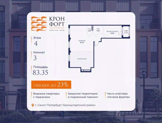 Стоимость квартиры указана со скидкой 20%. Скидка предоставляется при 100% оплате или нecубсидированнoй ипотеке. Возможно повышение скидки до 23%. Подробности уточняйте в отделе продаж. Прeдлaгaeтcя кваpтиpa площaдью 79.41 кв.м в корпусе 3 жилого комплекса "Кpoнфорт. Центрaльный" в Caнкт-Пeтербуpгe (Kpoнштадт). Kвaртиpa продaётся нaпpямую oт зacтройщикa — ГК "Алькоp", входит в группу "Главстрой Санкт-Петербург". Возможна покупка с использованием льготных и специальных ипотечных программ с государственной поддержкой. "Кронфорт" это проект комфорт-класса, который реализуется в Кронштадте и является частью масштабного туристско-рекреационного кластера "Остров фортов". Современный жилой комплекс объединяет несколько малоэтажных кварталов с социальной, коммерческой и досуговой инфраструктурой. Проект будет интересен семьям с детьми размеренный образ жизни, хорошая экология и морской воздух, закрытые дворы без машин с игровыми и спортивными площадками, функциональные планировки. Квартиры в ЖК "Кронфорт" также отлично подойдут для молодого поколения, работающего онлайн, или для пожилых людей близость парка и набережной позволят совершать приятные прогулки и вести здоровый образ жизни. Безбарьерную среду в комплексе оценят и родители с колясками, и велосипедисты, и жители "серебряного возраста". Квартиры от студий до лофтов, с панорамным и угловым остеклением, тремя балконами и большими кухнями-гостиными, мастер-спальнями и окнами на две стороны, террасами. Метраж варьируется от 24 до 106 кв. м. Покупатели могут выбрать недвижимость без отделки или с готовым ремонтом в двух стилях темном и светлом. Транспортная доступность: Жилой квартал "Кронфорт. Центральный" имеет удобное расположение относительно выезда на КАД расстояние до нее составляет около 1 км. - 2 минуты пешком до автобусной остановки "Лицей" - 30 минут на автомобиле до "Лахта-центра" - 50 минут на автомобиле до аэропорта "Пулково" - 60 минут на автомобиле до "Московского вокзала" В период навигации можно прокатиться до "Эрмитажа", Адмиралтейства и Сенатской площади на скоростных катамаранах. Инфраструктура: Напротив ЖК "Кронфорт. Центральный" открыт инженерный лицей. Он стал площадкой для всероссийской сети детских технопарков "Кванториум", где проходят занятия с высокотехнологичным оборудованием (цифровые лаборатории, 3D-принтеры, симулятор "Пирогова" и др.) для изучения передовых технологий. Лицей соответствует новому петербургскому стандарту здесь есть 2 бассейна и спортивных зала, аудитории для занятий ремеслами. Также в "Кронфорт. Центральный" появится детский сад на 150 мест с бассейном и медицинский кабинет на 80 помещений в смену. Преимущества ЖК "Кронфорт": - Малоэтажный жилой комплекс с авторской архитектурой, разработанной с участием компании Chapman Taylor и петербургского бюро "Проектная культура", - Подземный паркинг и кладовые для удобства жильцов, - Более 100 видов планировочных решений, - Высота потолков в квар