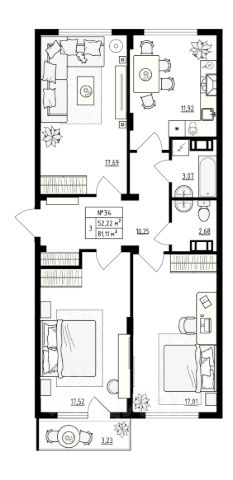 Три изолированные просторные комнаты 17,2 кв.м., 16,7 кв.м. и 12,0 кв.м..