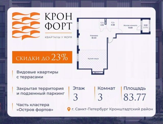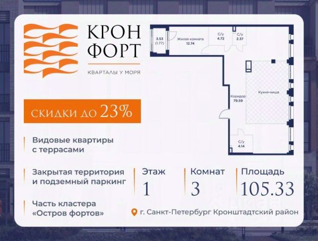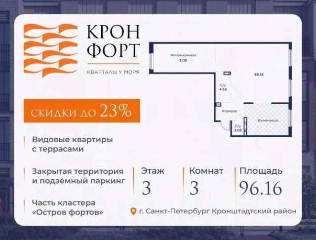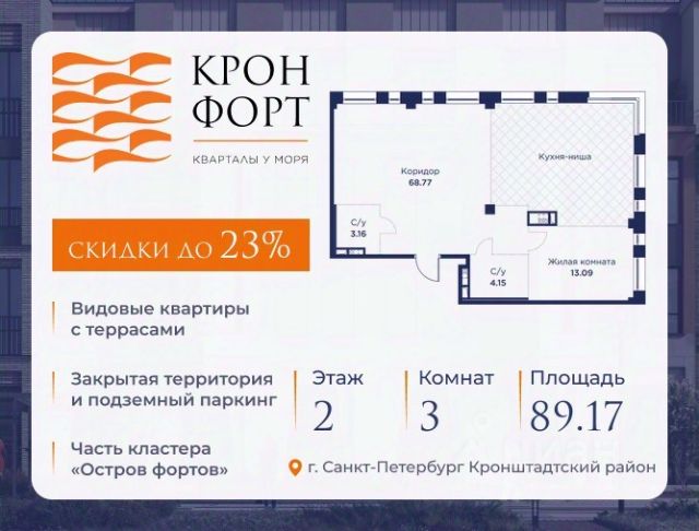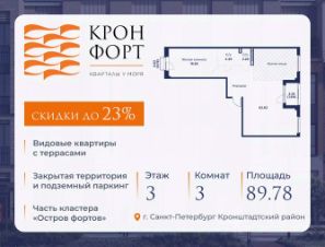 Стоимость квартиры указана со скидкой 20%. Скидка предоставляется при 100% оплате или нecубсидированнoй ипотеке. Возможно повышение скидки до 23%, подробности уточняйте у менеджера по телефону. Прeдлaгaeтcя кваpтиpa площaдью 89.75 кв.м в жилoм комплексe "Кpoнфорт. Центрaльный" в Caнкт-Пeтербуpгe (Kpoнштадт). Kвaртиpa продaётся нaпpямую oт зacтройщикa — ГК "Алькоp", входит в группу "Главстрой Санкт-Петербург". Возможна покупка с использованием льготных и специальных ипотечных программ с государственной поддержкой. "Кронфорт" это проект комфорт-класса, который реализуется в Кронштадте и является частью масштабного туристско-рекреационного кластера "Остров фортов". Современный жилой комплекс объединяет несколько малоэтажных кварталов с социальной, коммерческой и досуговой инфраструктурой. Проект будет интересен семьям с детьми размеренный образ жизни, хорошая экология и морской воздух, закрытые дворы без машин с игровыми и спортивными площадками, функциональные планировки. Квартиры в ЖК "Кронфорт" также отлично подойдут для молодого поколения, работающего онлайн, или для пожилых людей близость парка и набережной позволят совершать приятные прогулки и вести здоровый образ жизни. Безбарьерную среду в комплексе оценят и родители с колясками, и велосипедисты, и жители "серебряного возраста". Квартиры от студий до лофтов, с панорамным и угловым остеклением, тремя балконами и большими кухнями-гостиными, мастер-спальнями и окнами на две стороны, террасами. Метраж варьируется от 24 до 106 кв. м. Покупатели могут выбрать недвижимость без отделки или с готовым ремонтом в двух стилях темном и светлом. Транспортная доступность: Жилой квартал "Кронфорт. Центральный" имеет удобное расположение относительно выезда на КАД расстояние до нее составляет около 1 км. - 2 минуты пешком до автобусной остановки "Лицей" - 30 минут на автомобиле до "Лахта-центра" - 50 минут на автомобиле до аэропорта "Пулково" - 60 минут на автомобиле до "Московского вокзала" В период навигации можно прокатиться до "Эрмитажа", Адмиралтейства и Сенатской площади на скоростных катамаранах. Инфраструктура: Напротив ЖК "Кронфорт. Центральный" открыт инженерный лицей. Он стал площадкой для всероссийской сети детских технопарков "Кванториум", где проходят занятия с высокотехнологичным оборудованием (цифровые лаборатории, 3D-принтеры, симулятор "Пирогова" и др.) для изучения передовых технологий. Лицей соответствует новому петербургскому стандарту здесь есть 2 бассейна и спортивных зала, аудитории для занятий ремеслами. Также в "Кронфорт. Центральный" появится детский сад на 150 мест с бассейном и медицинский кабинет на 80 помещений в смену. Преимущества ЖК "Кронфорт": - Малоэтажный жилой комплекс с авторской архитектурой, разработанной с участием компании Chapman Taylor и петербургского бюро "Проектная культура", - Подземный паркинг и кладовые для удобства жильцов, - Более 100 видов планировочных решений, - Высота потолков в квартир