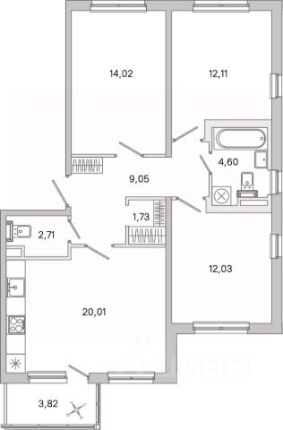 Продается квартира 473, по адресу г. Санкт-Петербург, поселок Шушары, Чудовская улица, дом 14, корпус 1, строение 1, корпус ЖК Монография в Монография на 2 этаже, с площадью 69.7 м2.